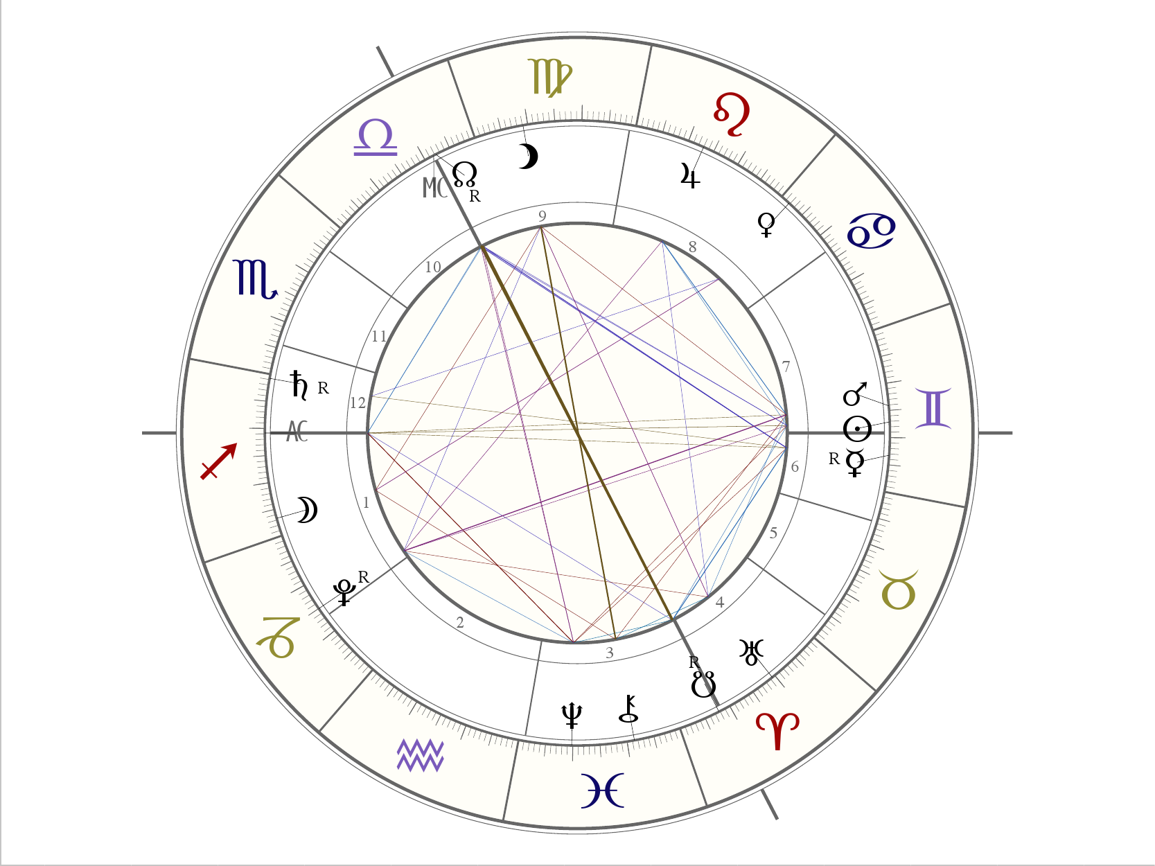 hier sehen wir prominent am MC die Waage mit Nordknoten: Schütze steigt auf – aber Jupiter im Löwen, Schütze-Regent, steht im 8. Haus: Döbereiner drückt sich euphemistisch aus: „Die Vorstellungen der Anderen“ … und als wäre das nicht schon genug: auch Venus ist in Haus 8 – nun würde ich gerne sagen: „Keine Angst vor Haus 8, Leute … “ – doch zwei bestimmende Faktoren sind Wandel – bezieht sich auf Familie (Krebs) & Selbstbewußtsein (Löwe) … Na und? – müssen wir jetzt in die Knie gehen? –