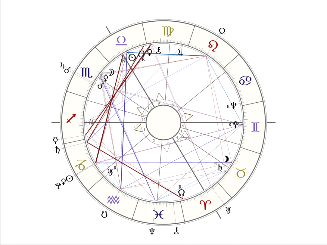 Südknoten/Pluto geben dem power aus der Vergangenheit – nichts Gutes – aber Mephistopheles kommt gleich mit einem Sack Geld. Jupiter hält den selben Abstand zur beglückten Sonne, wie im Geburts-Horoskop und stehen gut im Trigon von Luft- zu Luftzeichen aus der künstlerischen Waage.
