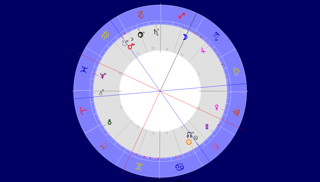 es ist immer wieder dieser Zauber der äußerst exakten Aspekte, wie hier dem Trigon des Mondes zur super genauen Konjunktion Mondknoten/Glückspunkt im Zeichen Löwe, gerade in der Minute, da die Sonne das Zeichen Löwe betrat. Dieser Aspekt ist mit der Scheibe eingestellt. Es macht den Eindruck, als würde das große Uhrwerk uns den Gefallen tun, der astrologischen Harmonielehre ein so sauberes Beispiel zu geben, man wird förmlich mit der Nase drauf gestupst. Der Eindruck sagt: „es ist um die Löwe-Wassermann Dinge zu tun“ – Vertrauen vs. Zweifel, Natur vs. Technik, Triumph vs. Analyse, Selbstherrlichkeit vs. Freiheit.