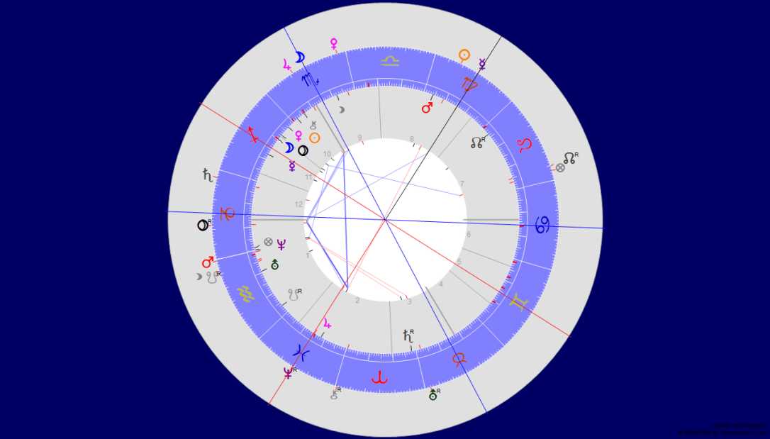 Wir sehen dazu die exakte Opposition von Neptun und Merkur – der Druckabfall (obwohl nicht dramatisch, angeblich) – stellt eine physische Bedrohung für Schiff und Besatzung dar (Häuser 2/8). Bemerkenswert, dass das Loch von innen gebohrt wurde (nicht, wie ursprünglich angenommen, durch einen Mini-Meteoriten) – Pluto, der teuflische, steht ja nicht am Deszendenten, sondern am Aszendenten, ebenso Mars laufend in Konjunktion mit Neptun Radix. Man weiß aber nicht, ob in einer Art Sternenkoller, wie wir ihn so oft aus den S/F Filmen kennen, oder am Boden von einem durchgeknallten Handwerker – beides ist gleichermaßen verrückt und unwahrscheinlich.