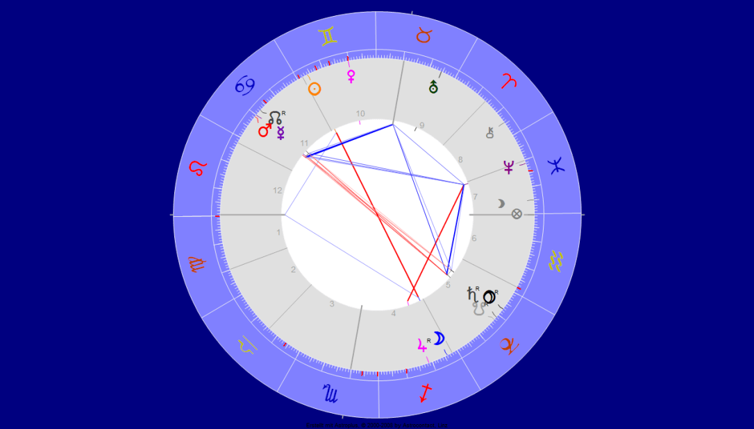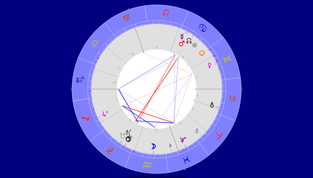 Es ist – um ein paar Beispiele zu nennen – seine Venus im Stier, die in ihr Partnerhaus passt. Es ist seine Jungfrau-Sonne, die vom Sohn mit Jungfrau-Mond nach ihrer mütterlichen Energie befragt wird, denn die Mutter kommt – wie, um das zu unterstreichen, aus dem Gegen-Zeichen Fische und hat Mond im Widder.