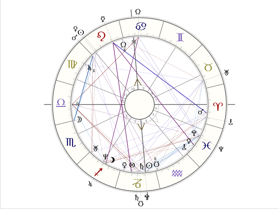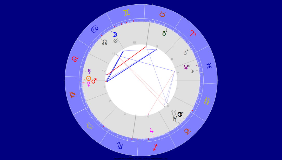 Jupiter und Neptun sind zusammen wie ein gespanntes Schiff, hart am Wind, wie man im unteren Horoskop sieht. Die Löwe-Planeten und der Nordknoten stelle ich mir als Segel vor. Merkur gerade dabei, auch ins Zeichen Löwe zu wechseln, wo schon Venus/Mars und Sonne sind.