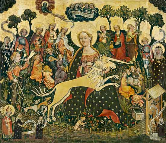 Obwohl sich das Einhorn freiwillig zur Jungfrau begibt, muss doch befürchtet werden, dass es die Begegnung mit der Jungfrau einen Opfer-mäßigen Ausgang hat, der Schlaf des Tieres einer zu den ewigen Jagdgründen sein wird, gerade weil die Jungfrau natürlich „lieb“ ist, ist sie auch gnadenlos, wenn es um Überzähliges geht, ist also auch die Opfer-Priesterin. Überzählig sind – wie die geschredderten männlichen Küken – bei Milch und Käse produzierenden Gesellschaften nach dem Sommer die männlichen Nachkommen, soweit man sie nicht zur Zucht braucht oder verochsen kann zum Zugtier; – weswegen Milchwirtschaft ohne Fleischwirtschaft nicht geht und all das kreisläufig an Wachstumszyklen und ein Hofdüngungssystem gekoppelt ist, das zu den hohen kulturellen Errungenschaften des Abendlandes gehört und weite Teile der europäischen Landschaft so nachhaltig prägen konnte – auch über die Klosterwirtschaft – dass sie heute noch so aussieht und von uns mit reiner, ursprünglicher Natur verwechselt wird.