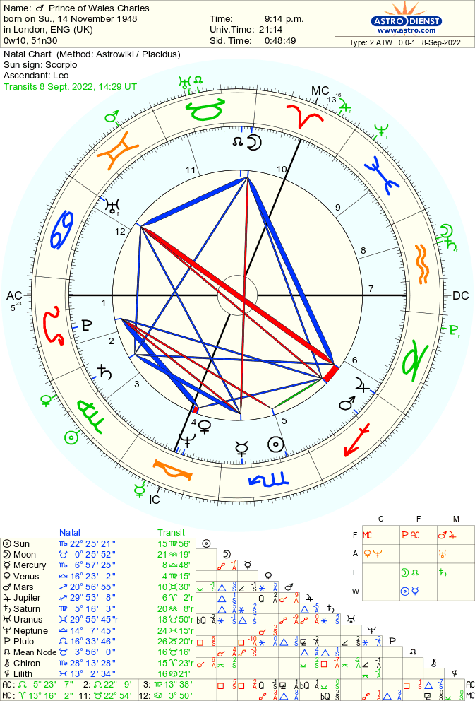 Charles ist der Natur verbunden – das wäre gut – Charles ist Davos-Clique – das ist schlecht. Am 03.06.2020 hat er den Great Reset verkündet. Wir sehen, wie sein Mond wirklich exakt dort steht, wo die Mom ihre Sonne hatte, und zwar genau dort, wo sie astrologisch hingehört: im Haus 10.
