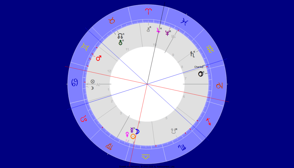 Nordstream II zeigt mit dem exakten Mars/Uranus Quadrat die Anlage zur Zerstörung bereits bei Baubeginn. Der Neptun in der Himmelsmitte und überhaupt das große Wassertrigon zwischen AC, Neptun und dem rückläufigen Skorpion-Jupiter passt wohl unzweifelhaft für eine Gas-Pipeline durchs Meer. Die Lilith/Pluto (plus Saturn im Zeichen) Konjunktion zu Baubeginn von NS II steht mit Saturn einem Krebs-AC gegenüber, durch den jetzt oppositionell Lilith läuft („fair is foul and foul is fair“ – ist was faul im Staate Dänemark).