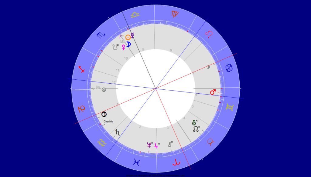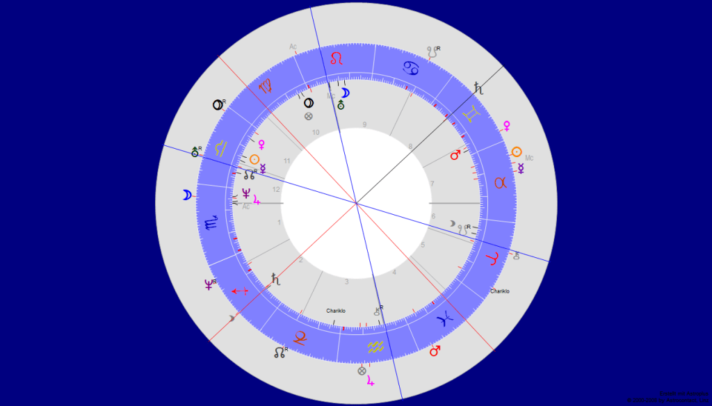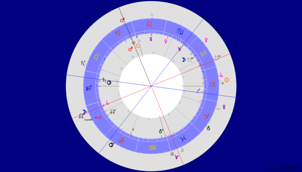 Dem gegenüber stehen Sonne in Waage mit Venus und Merkur in je eigenen Zeichen Waage und Jungfrau. Im Grunde ein prächtiges, wenn auch nicht ganz objektives Bild (Venus ist „sonnenverbrannt“ – weiß man, was einem gefällt?).