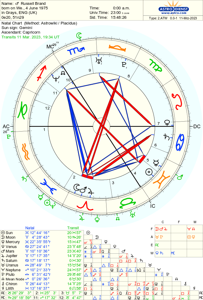 Ich stelle Brand und Tucker hier gegenüber, weil sie beide Ihr Sprach-Talent bilderbuchmäßig mit Merkur in Zwillinge leben, Brand sogar rückläufig, und weil sie bezeugen, wie sich gegenwärtig eine so gefürchtete Verbindung entfaltet über politische Lager hinweg. Tucker ist der „Rechte“ mit dem ehrlichen Country-man-Image, Brand ein eigentlich „Linker“ auf unbestechlicher Selbstfindungsreise, in die er Persönlichkeiten aus aller Welt einbezieht. Und durch die vergangenen drei Jahre nicht zu täuschen.