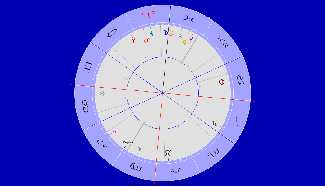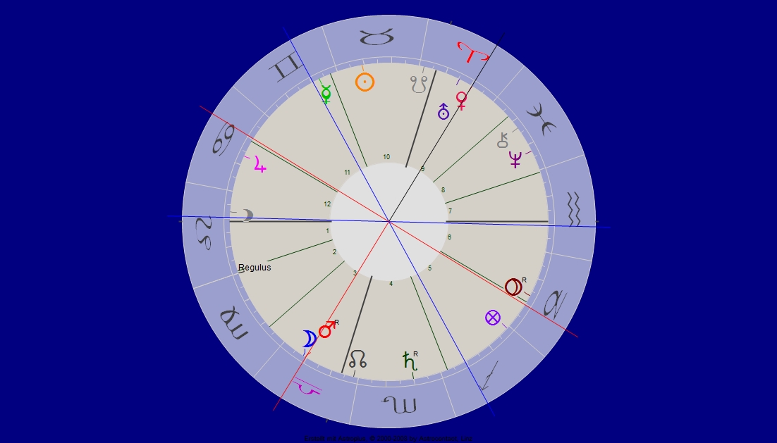Pluto in Haus 7 – starke Widerstände. Natürlich passt Lilith bei Haus 4 hervorragend zu Gebäude & Nachbarschaft. Dafür aber Venus/Uranus Konjunktion und Merkur, Herr von 4 & 12 in 9 – bin gespannt, was der plutonische Widerstand will. Mond in 3 in Löwe noch kurz vor Regulus in Jungfrau ist aber auch nicht ohne, übergänglich zwar, aber von gutem Stand wg. Regulus – Jupiter zwar rückläufig in 2 – Aber mit Venus/Uranus Trigon aus dem Haus der Berufung. Chiron in 10 braucht Ausdruck, sonst läuft´s nicht …