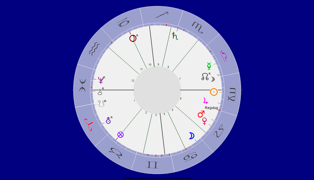 Mond läuft im Zeichen Löwe, Saturn im Wassermann. Der lebenslustige Löwe-Mond wird von außen durch Wassermann-Seriosität oder Narretei – nur die andere Seite der selben Münze – ausgebremst. Eine Spaßbremse.