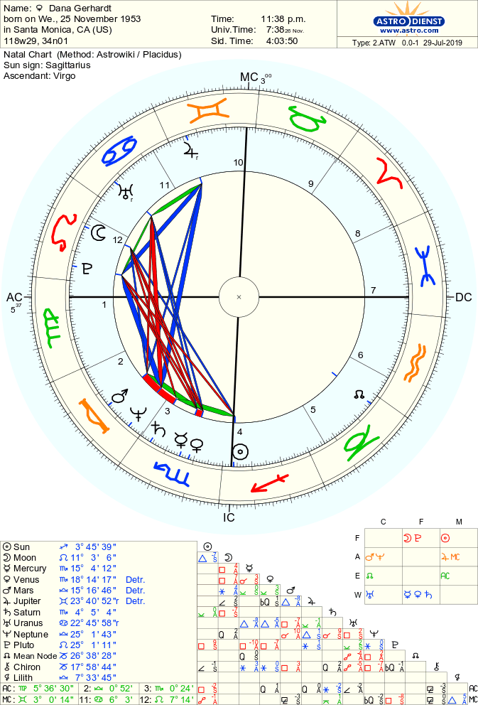 Ob Dana Gerhardt Musik macht, weiß ich nicht, aber sie ist eine inspirierende Astrologin – Merkur/Venus/Saturn im dritten Haus im Zeichen der Tiefe, Skorpion. Dafür ihr Jupiter, der Meister, im Zwillinge-Zeichen im Modus des Rückwärts-„Ganges“*. Hier ist Hermes bei den Kabiren, Κάβειροι, älter, wie selbst Zeus, manchmal nur eine vierkantige Marmorsäule – und eben die Schütze-Sonne ganz stark im Ahnen-Eckhaus, nur Planeten im ersten und 4 Quadranten.