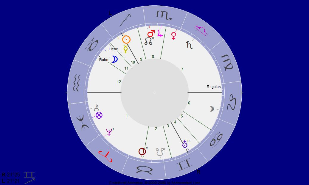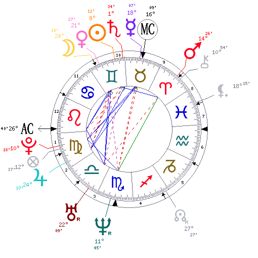 Im Horoskop sehen wir die Uranus-Pluto Opposition = Gegensatz von Freiheit und Machtanspruch, und auch das Jupiter/Neptun Radix und Chiron/Neptun Transit Quadrat, was beides Neptun – einmal mit Großartikeit im Radix Anspruch und dann mit Verletzung in der quadratisch transitierenden Realität anbietet.