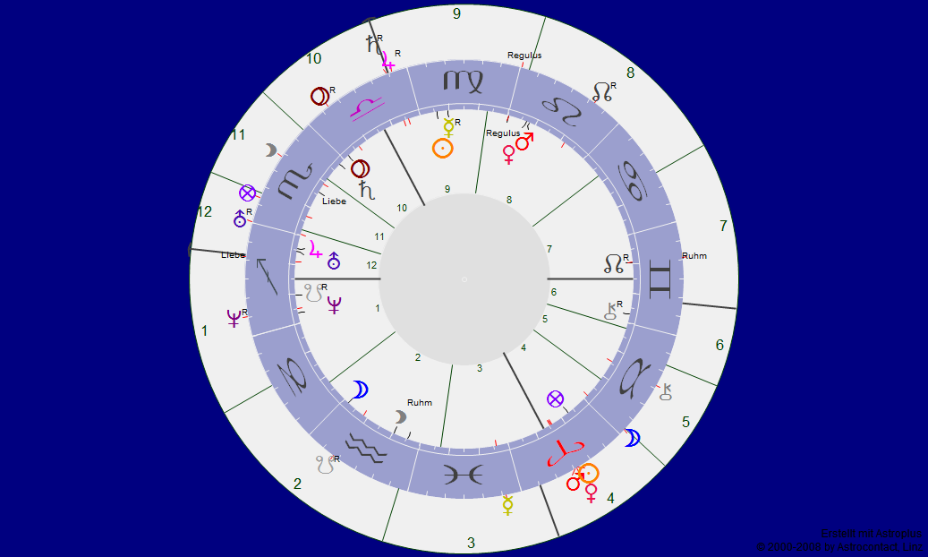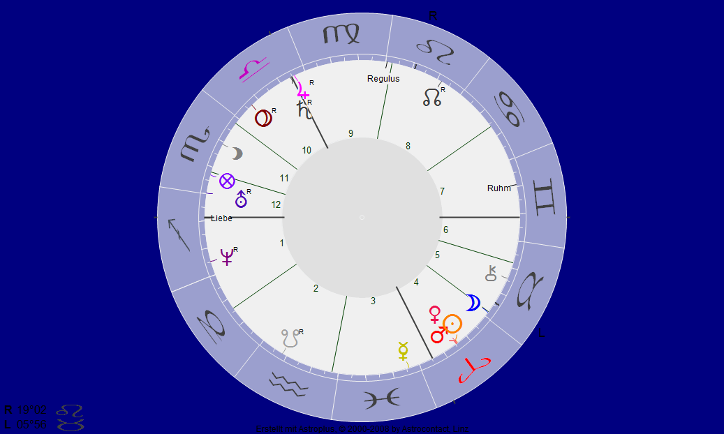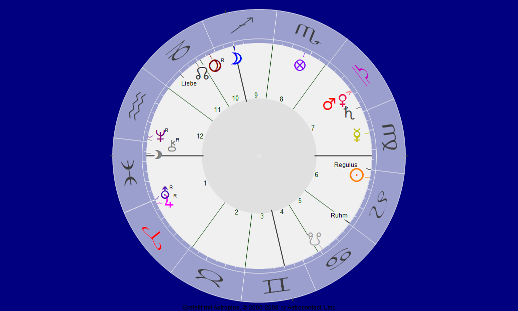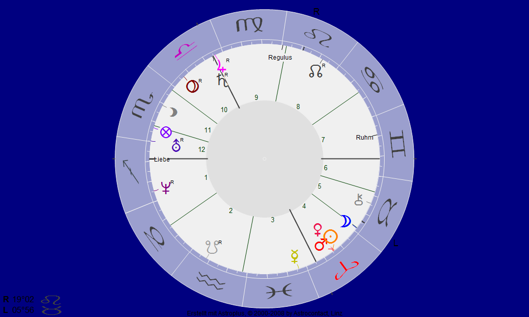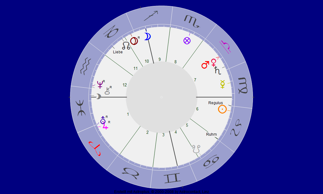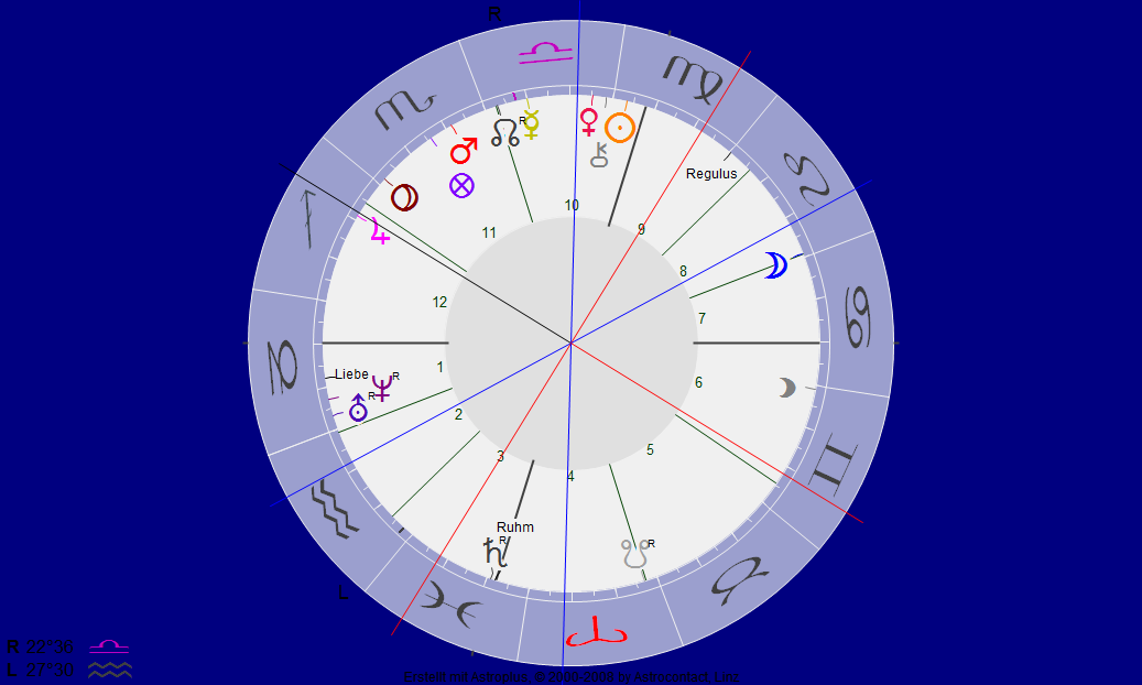 Auffallend übereinstimmend ist die Uranus-Chiron Opposition (wenn auch nicht sehr exakt) bei beiden auf der Elternachse. Uranus passt zu den plötzlich und unvermittelt auftretenden Panik-Anfällen und Chiron ist hier eben der Dauerkonflikt einer dem Menschen durch ein völlig verkrachtes Elternhaus zugemuteten seelischen Wunde – aber im 10. Haus ist auch die Aufgabe, das Amt, die Würde der gemeinschaftlichen Autorität, die hier verletzt ist, der Heilung bedarf.