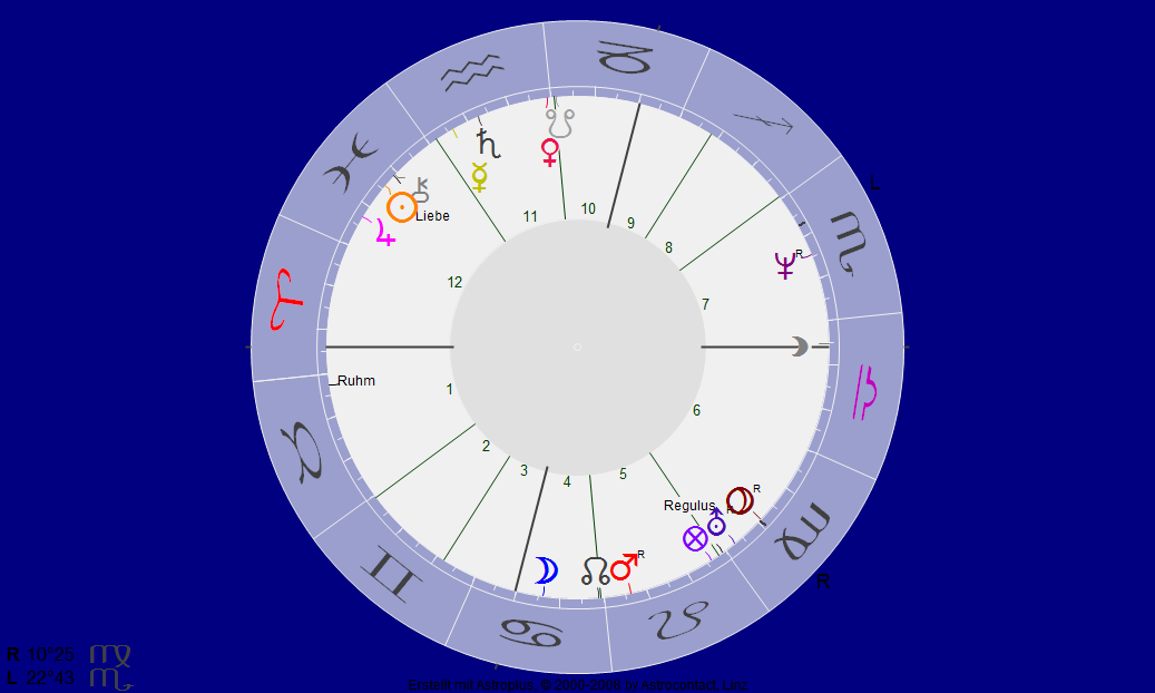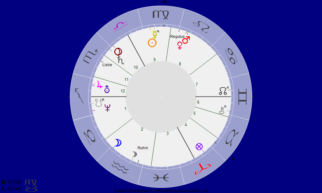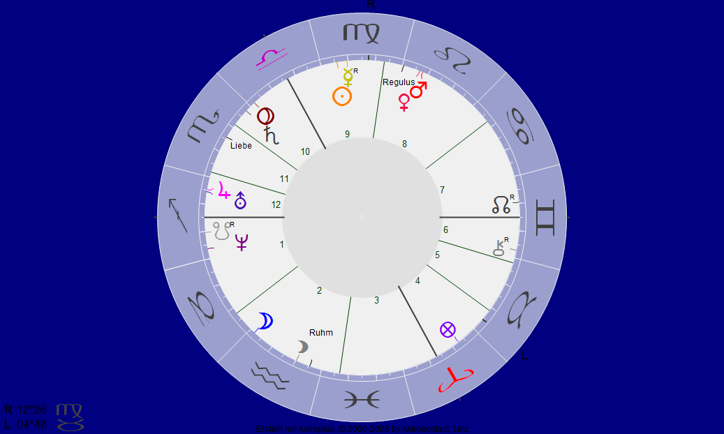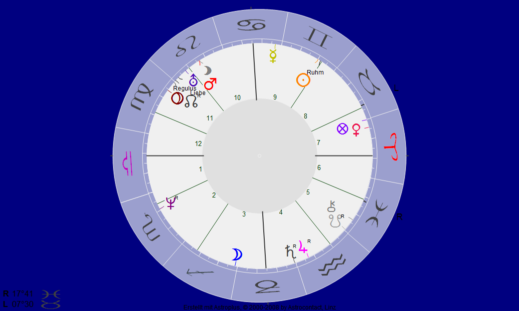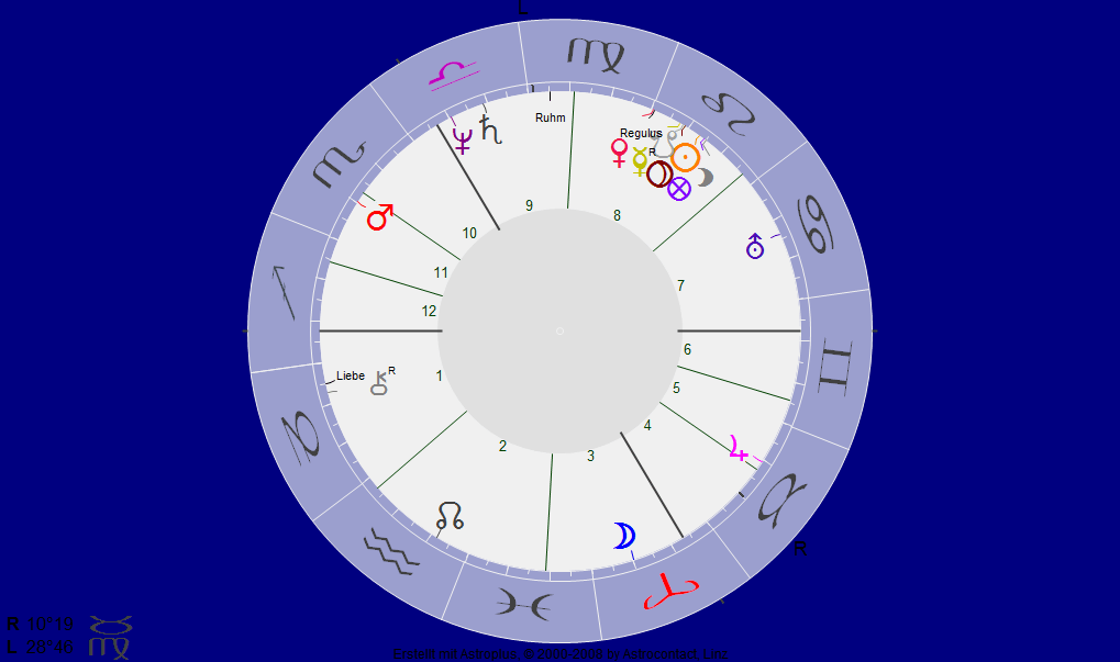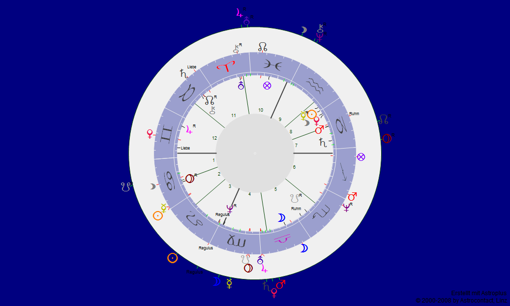 Auffallend übereinstimmend ist die Uranus-Chiron Opposition (wenn auch nicht sehr exakt) bei beiden auf der Elternachse. Uranus passt zu den plötzlich und unvermittelt auftretenden Panik-Anfällen und Chiron ist hier eben der Dauerkonflikt einer dem Menschen durch ein völlig verkrachtes Elternhaus zugemuteten seelischen Wunde – aber im 10. Haus ist auch die Aufgabe, das Amt, die Würde der gemeinschaftlichen Autorität, die hier verletzt ist, der Heilung bedarf.
