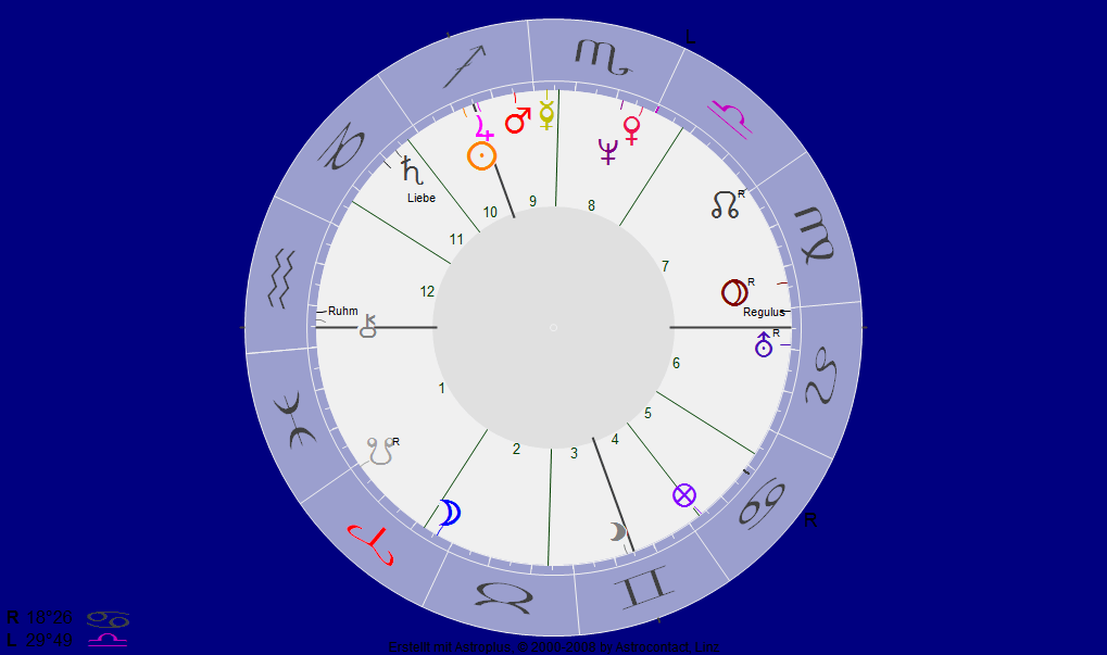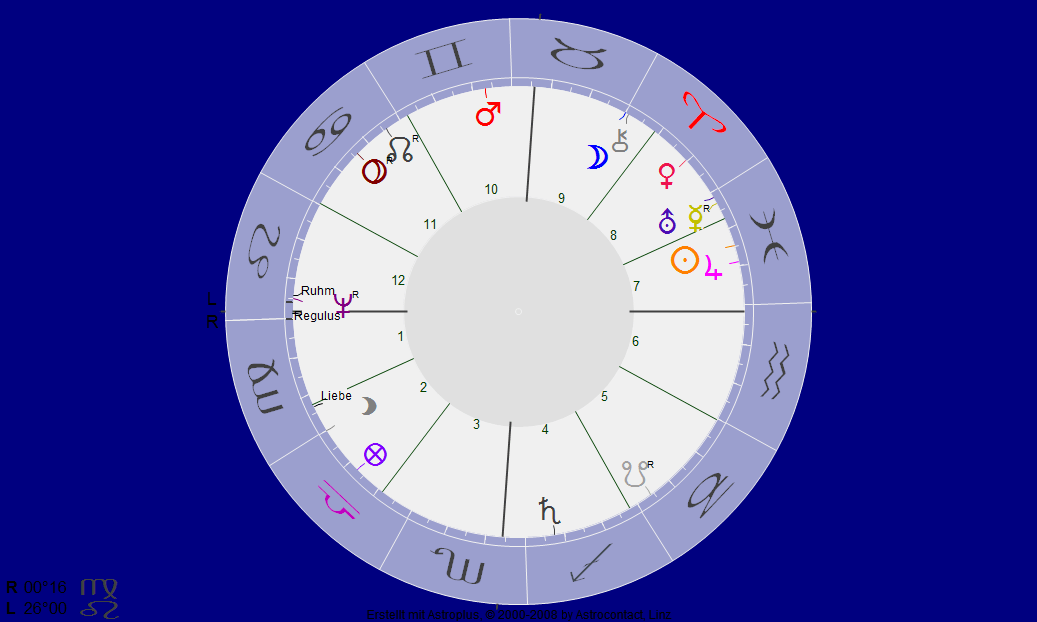 Um Missverständnissen vorzubeugen: dies ist eine astrologische, keine medizinische oder psychotherapeutische Betrachtung. Sollten Sie selbst solche Probleme haben, kann Astrologie allerdings ein wichtiges Selbsterkenntnisinstrument werden, um den Willen zu entwicklen, die Störung zu meistern. Dazu aber reicht eine Beratung nicht aus, besser ein Buch, um Astrologie zu lernen: z.B. Claus Riemann, „Der Tiefe Brunnen“ zusammen mit Fritz Riemanns „Astrologie als Lebenshilfe“ sind ein guter Einstieg für den Ausstieg aus der Angst. Fritz Riemann, der Vater, ist auch der Autor des psychologischen Grundlagenwerks „Grundformen der Angst“. Beide Bücher parallel lesen als Abkürzung direkt in die Sache, das eigene Horoskop daneben …