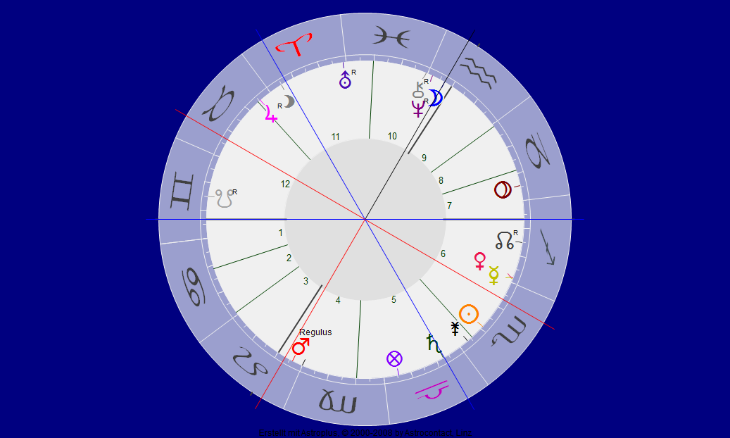 Pluto in 7 sind natürlich die Reaktionen, mit denen ein solches Projekt zu rechnen hätte: die ganze Autorität der gewachsenen Struktur bislang. Immerhin steht Jupiter, Herr vom Haus der Gegner, schwach = rückläufig im Stier im fremden Haus. Und ich?