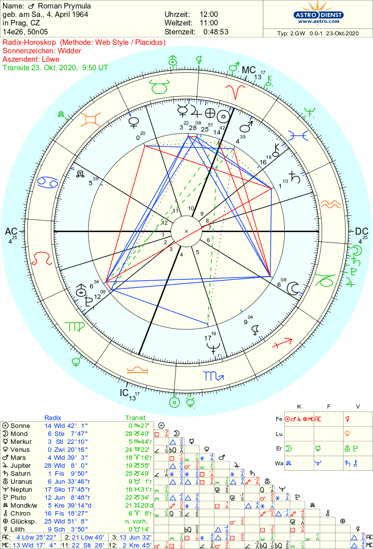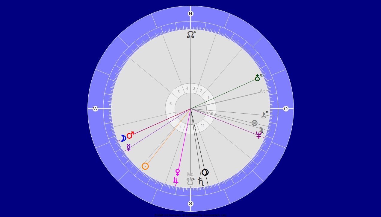 perfekt, nichts wahr? – es ist alles da: der Widder bricht durch mit einem Mega-Stellium, Neptun für Filmillusionen, Jupiter mit Jungfrau – alles genau machen, Mond in Steinbock: nicht einfach, nicht wirklich warmherzig. Mondknotenachse Wassermann/Löwe – bringt lauter Ego-Könige hervor … Mars im Krebs in Mond-Opposition: trotzdem empfindlich …