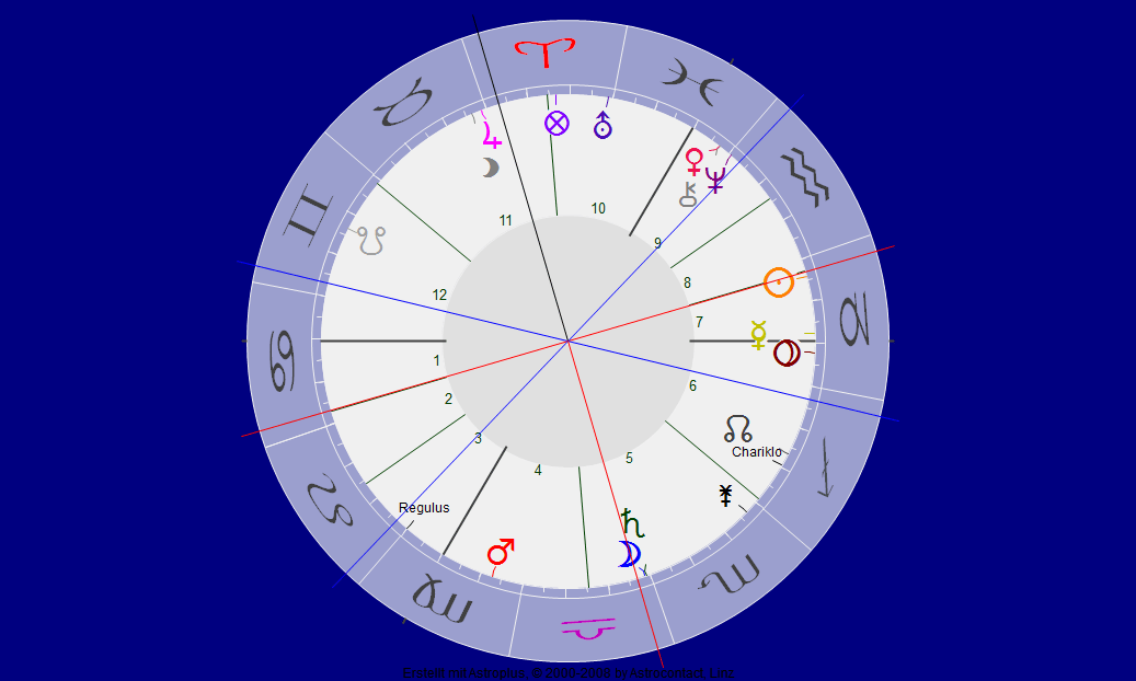 Mal ganz unabhängig von den Dingen, die sich in David de Rothschilds Horoskop zeigen, fällt doch eines besonders auf: die Harmonie zwischen den Aspekten: Mond – Uranus – Neptun und Mars vor allen Dingen, aber dann auch dem mächtigen Jupiter plus Lilith und Pluto nahebei, die Konstellation für großen Reichtum, und natürlich deren Beziehung zum Mars im Skorpion, was die Umsetzung stärkt. Dann die zentrale Stellung der Glückskonstellation zumindest im geburtszeitlosen Horoskop, denn nur dieses habe ich gefunden. Harmonisch, in Spannung genau ausgewogen; ich habe die Aspektscheibe so eingestellt, daß diese Harmonie deutlich erkennbar ist.