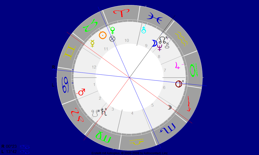 Die Familie steigt tatsächlich als Krebs am Osthorizont auf, und sie steht in den Fischen als Mond in Haus 9, dem Haus der Seereisen. Passender könnte es nicht sein. Was auffällt, ist die Anwesenheit von Mars in Haus 1, der eine latente Gewaltmöglichkeit immer hergibt. Mars hat ein Quadrat zum Glückpunkt, der ganz an der Spitze zu Haus 11 und in genauer Konjunktion zu Venus steht, im Widder: dies sind die Plünderer, die Hab und Gut einfach durch Glück in die Hände bekommen, indem sie Initiative ergreifen, und das Schiff plündern. Was jedoch das Ehepaar am meisten aufbringt, ist die Ignoranz der Reederei und der Behörden, die weder ein Interesse zu haben scheinen, das Schiff zu bergen, noch Hab und Gut der Passagiere zu retten. Wer sind sie im Horoskop? Sie werden vertreten durch die Herrscher von 10: Jupiter, Neptun. Wenn man nun bedenkt, dass die Familie Toth Geimers durch den Mond dargestellt ist, so ist eben der Mond in den Fischen wahrlich abhängig von Neptun und Jupiter. Jupiter steht schwach im Steinbock, doch stark in einem Eckhaus: die Position der Reederei ist stur und unverrückbar, also steinbockmäßig. Neptun bildet eine schicksalhafte Konjunktion zum Mondknoten: das ganze seefahrerische Konzept der Reederei und der Behörden wird letztlich durch die Havarie verändert werden. Dies bezieht sich nicht nur auf den einen Unfall der Fähre. Neptun steht im Haus 8, dem Haus der Veränderung und vielleicht des Todes. Demnach, und gemäß der Politik des Verschweigens, wird sich die Reederei in Existenznöte bringen, wenn sie nicht schon längst darin ist. Und auch auf den Canaren werden neuerdings Entscheidungen von Provinzfürsten und Bürokratie – in Spanien, gelinde gesagt, nicht besser, als bei uns – nicht einfach mehr so hingenommen. Der Mond, den wir als die Familie sehen, steht in Opposition zu Saturn, der aber auch Herrscher von Haus 7, also Herrscher des Hauptsignifikanten der Reederei ist. Und er steht – zum x-ten Male betont an dieser Stelle – am Punkt der Mondfinsternis vom 21. Februar 2008, der bekanntlich „Vertuschungen und Intrigen“ bedeutet. All dies ist hier zutreffend und anschaulich durch das Horoskop geschildert. Peter Toth hält trotz seines Namens scheinbar wenig von Esoterik. Das ist für einen Philosophen schade, denn er entäußert sich damit der Möglichkeit, seine Lage als den Beginn von etwas Neuem aufzufassen, aus dem ihm Freiheit erwachsen kann, die viel mehr wert sein könnte, als aller materieller Besitz oder Erinnerungsstücke. Speziell an diesem Punkt, beim Jammern wegen verlorener Erinnerungsstücke, fehlt mir das Verständnis. Sollte man doch froh sein, von ihnen befreit zu sein. Freilich bedarf es vielleicht eines solchen Paares, um die Reederei letztlich das Fürchten zu lehren. Denn sie scheinen entschlossen zu sein, ihr Leben diesem Kampf zu widmen. Dass die Reederei und die Behörden durch Neptun in Haus acht vertreten sind, zeigt auf, wie hier der Betrug überhaupt Ursache einer Taktik der Verschleierung ist. Irgendwo versucht einer die Hand aufzuhalten und viel Geld von einer Versicherung zu kassieren. Uranus zeigt jedoch mit einem Sextil zu Jupiter an, dass die scheinbar Unbeweglichen sich werden bewegen müssen. Die Versicherung verspricht auch für die Familie Toth Geimer der Hebel zu werden, bei dem sie ansetzen können. Immerhin geht auch der Mond eine Konjunktion mit Uranus ein, der das Haus 8 regiert, also die Versicherung. Bleibt zu wünschen, dass die Toth Geimers ihren Hungerstreik rasch beenden und sich trotz des Kampfes gegen das betrügerische Monster, das die Reederei zu sein scheint, der Botschaft des Glücks im Unglück nicht gänzlich verschließen. Das Sextil von Uranus zu Jupiter, dem auch der Mond, also die Familie begegnen wird, deutet darauf hin, dass man sich irgendwie doch einigen wird. Wer mehr lesen will, suche unter dem ganz unten angegebenen Link in der Blogroll von La Palma Aktuell – Frische Nachrichten aus La Palma.