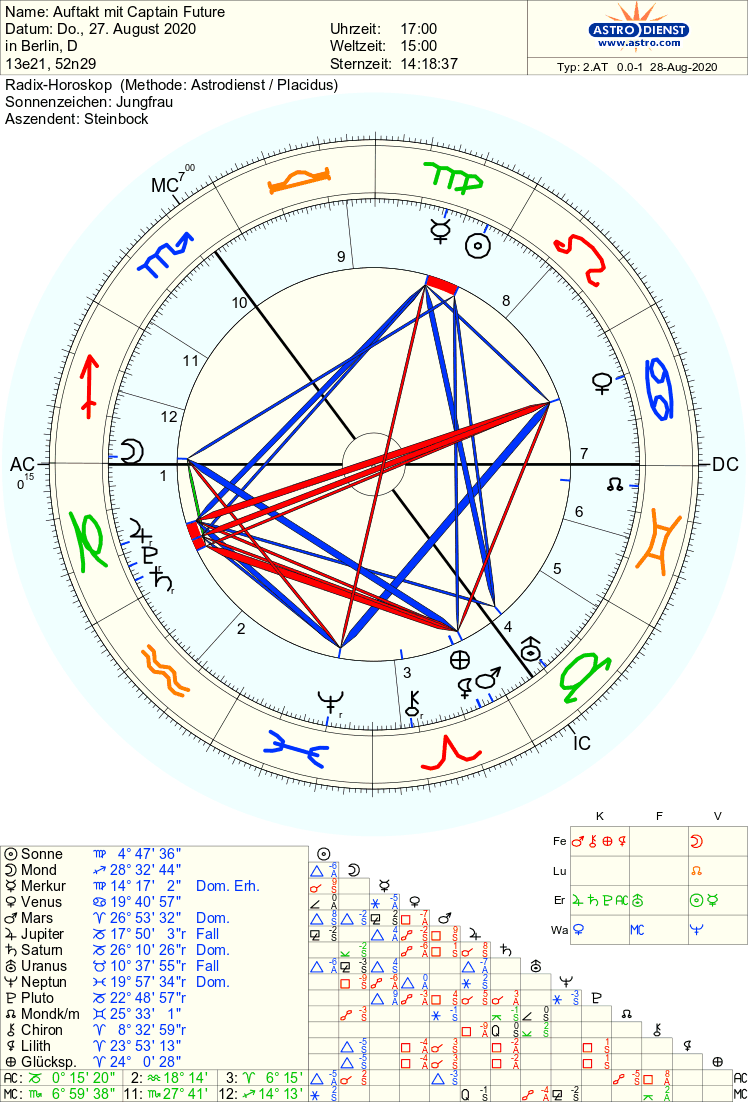 Ansonsten ist das Horoskop denkbar schwierig: gerade steigt der harte Steinbock-Teufel auf. Aber auch der Schütze-Mond – ad astra – im Feuerzeichen Schütze. Steinbock-Krebs, Mauer oder Miteinander. Saturn oder Venus: Neptun vermittelt, selbst in Opposition zum scheinbar vernünftigen Merkur in Jungfrau. An der Basis verhandeln die Außenminister darüber, wie groß der finanzielle Betrug (Uranus im Stier in Haus 4) wird, den sie anzurichten gedenken um ihr Wahnsystem zu „retten“.
