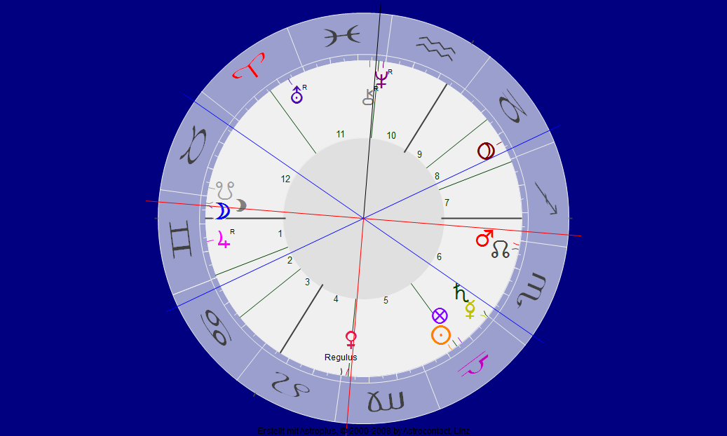 Hier fällt auf, dass Frau Rowling eine Pluto-Mond Konjunktion hat. Als Löwe-Sonne, die vor drei Tagen Geburtstag hatte, ist das Waage-AC-Horoskop ideal für eine super erfolgreiche Schriftstellerin. Allein schon Jupiter als Herrscher von drei in neun spricht die Sprache von sieben Bänden. Und erst noch Neptun in Haus zwei: „Verdiene Dein Geld mit Fiction“, flüstert hier jede Schneeeule. Sonne in Haus 10 ist tatsächlich das archetypische Mutterbild (und das Lebensziel, der Beruf), und so liegt es sehr nahe, dass Frau Rowling ihre eigene Geschichte von der zeitgleich verstorbenen Mutter im „Stein der Weisen“ verarbeitet hat, wenn die Mutter eine so überragende Bedeutung im Horoskop einnimmt. Haus 11 ist voller Energie. Der Mond an der Spitze zu 12 läßt sie praktisch fühlen, was die Massen brauchen (obwohl man mit so einem Mond, ganz wie Potter, selten selbst Kind sein durfte). Oskar Adler schreibt: „So gewinnt auch der wohlverstandene Egoismus des Jungfraumenschen durch den Mond die besondere Bedeutung eines reellen, im Interesse der Leistungssteigerung der Sonnennatur tätigen Gutsverwalters, der die eigenen Interessen durchaus in denen des Herrn sieht,“ also der Sonne. „Der Mond ist hier am Werke“, schreibt er weiter, „den frohen Lebensgenuss, den Sonne in Löwe liebt, ein wenig zu ökonomisieren.“ „Es ist so der Mond eine Art empirischer Wissenschaftler, aber die Wissenschaft, die hier betrieben wird, ist die Wissenschaft vom eigenen Ich auf empirischer Grundlage.“ Meiner Erfahrung nach macht Mond in der Jungfrau jedes Sonnenzeichen effizient und gleichzeitig vorsichtig, vielleicht sogar unnahbar. Wie bei Fische-Mond und Schütze-Mond spricht Adler hier von Mond-Orakel, der jedoch in diesem Fall gar nicht als unfehlbare innere Stimme, “ sondern als die Stimme der gesunden, wirklichkeitsgemäßen Logik angesehen werden will.“ Auch bei Mrs. Rowling dürfte die Sonnenfinsternis von Freitag eine bestimmte Wirkung entfalten, die etwas mit dem Beruf zu tun hat, denn ihre Sonne steht nur zwei Grad entfernt vom Ort der Finsternis. Als Transitbewegung paßt dazu natürlich Uranus in Haus 6, der die praktischen Dinge des Lebens, den Arbeitsprozess in andere, befreitere Bahnen lenken will. Zwar hat sie schon wieder ein Märchenbuch veröffentlicht, dessen Einnahmen sie spendet, aber ich bin sicher, dass ihr bald noch etwas anderes einfallen wird. „Erdmonde haben ein besonders tiefes und selbstverständliches Verantwortungsgefühl, sie verstehen etwas von tätiger Liebe und unsentimentaler Hilfsbereitschaft,“ schreibt Claus Riemann.