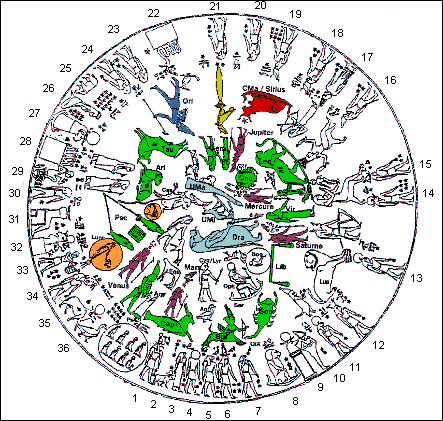 – Nürnberg – 22:38, dies ist eine schematische Farbdarstellung des Tierkreises mit den 12 Tierkreiszeichen, ca. 51 v. Chr. Dendara liegt 62 km nördlich von Luxor an der westlichen Niluferseite. Wir sehen die fünf Planetengötterdarstellungen in Lila, in der Mitte den Horusfalken auf einem Papyrusstab in gelb, Osiris/Orion blau, rechts vom Horusfalken, und Hathorkuh-Sopdet-Isis-Sirius mit Sirius zwischen den Hörnern rot, links von Horus dargestellt. Um die Planeten zu finden, müssen wir sie am Ort ihrer Erhöhung aufsuchen, also Merkur über dem Zweig der Jungfrau, Venus, doppelgesichtig, da sie Morgen- und Abendstern ist, beim Kopf des äußeren Fisches, Mars, Horus (der Rote) mit der Glyphe des Horusfalken auf dem Kopf auf dem Steinbock „stehend“, Jupiter mit der Glyphe eines Horusfalken auf dem Kopf als „Horus der Mystische“. Er berührt mit seinem Kopf den Krebs/Skarabäus (Chepre), sowie der stierköpfige Saturn mit der Glyphe des Horusfalken und eines Stieres über dem Kopf – Horus als Stier – mit einem Phoenixstab in der Hand, angeschmiegt an die rechte Waagschale der Waage. Der damit verbundene Osiris-Kult wird unten erklärt. Am Außenrand die 36 Dekanatsgottheiten, den ursprünglich wirklich nur 360 Tagen des alten Jahres entsprechend, die sich in vielen Kulturen finden. Alle Götter schauen nach Westen, vielleicht weil dort wohl ursprünglich die Sonne aufging (wie Herodot berichtet). In der Mitte die als Flusspferd dargestellte Schutzgöttin der Schwangeren Thoeris.