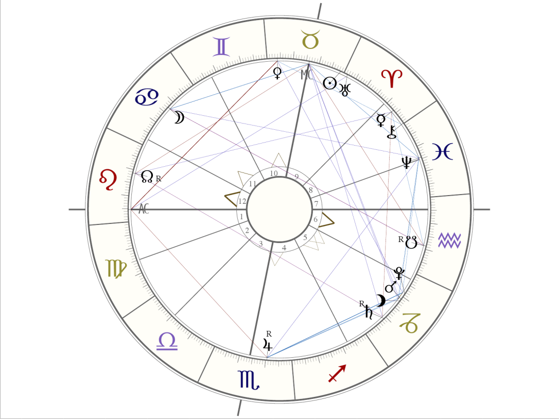 solche Fundstücke sind mir die liebsten Orakel. Venus steht hier prächtig im eigenen Zeichen in einem Eckhaus – mächtiger geht es nicht. Sonne als Herrin des aufsteigenden Löwen in Haus 9 – Ausland/Schreiben aber im Kontext des Wertes …
