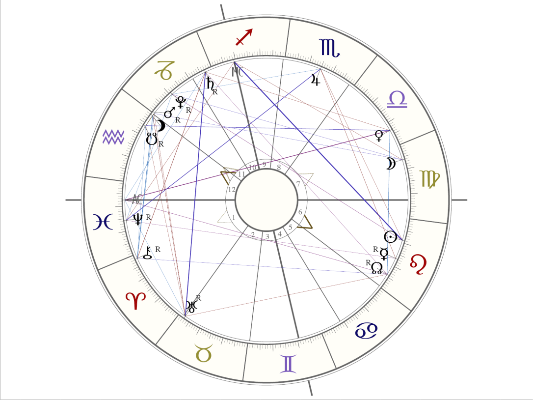 Neptun im Aufstieg – die kleine Gabel mit dem „R“ ganz links, wo die Fische sind, kurz unterhalb der beiden Buchstaben AC – ist über ein sehr genaues Trigon mit Jupiter in Skorpion verbunden = idealiter: Liebe und Wissen werden zur Einheit.