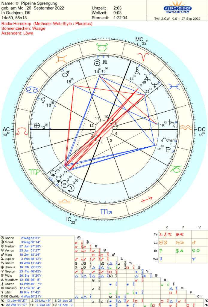 Nordstream II zeigt mit dem exakten Mars/Uranus Quadrat die Anlage zur Zerstörung bereits bei Baubeginn. Der Neptun in der Himmelsmitte und überhaupt das große Wassertrigon zwischen AC, Neptun und dem rückläufigen Skorpion-Jupiter passt wohl unzweifelhaft für eine Gas-Pipeline durchs Meer. Die Lilith/Pluto (plus Saturn im Zeichen) Konjunktion zu Baubeginn von NS II steht mit Saturn einem Krebs-AC gegenüber, durch den jetzt oppositionell Lilith läuft („fair is foul and foul is fair“ – ist was faul im Staate Dänemark).