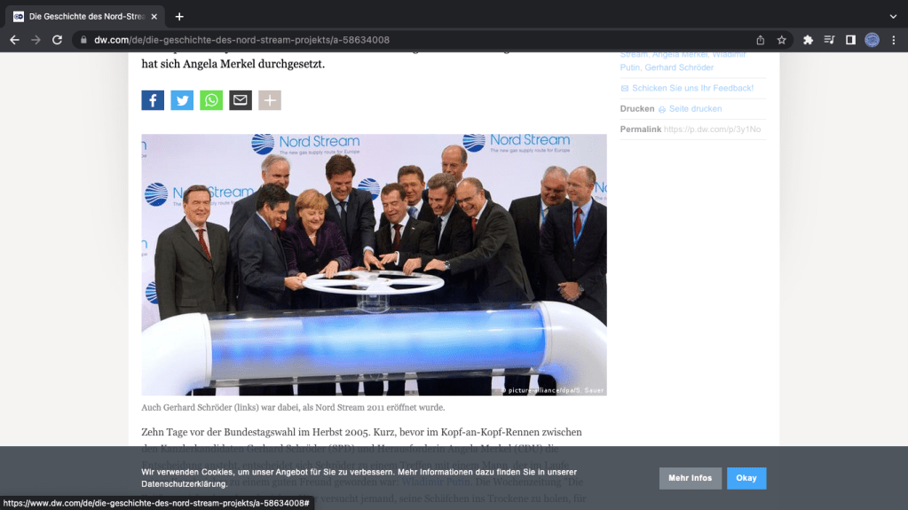 Who done it? Dreimal dürft ihr raten. Offensichtlich hat man in der Administration Skorpion nicht geglaubt, dass Deutschland die Irrationalität aushält, gleichzeitig zu frieren und das Gas in den Röhren I & II nicht zu nutzen. Da haben sie die Deutschen wohl unterschätzt. Hätten die Vernünftigen nicht in Lubmin demonstriert, vielleicht wäre dieses statuierte Exempel nicht vollzogen worden? – könnte man halb zynisch anmerken.