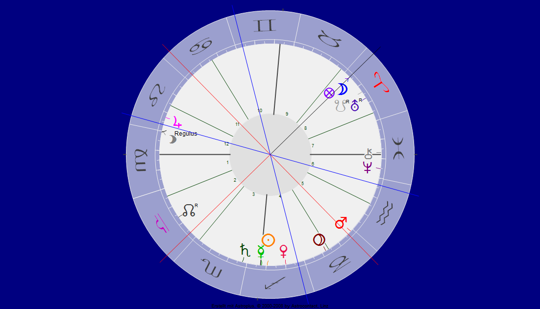 … zusammen mit Uranus und Südknoten im 8. Haus, explosive Mischung aus dem alten Karma, zumal auch trigonal zu Jupiter in Löwe – dabei Merkur – Herr des aufsteigenden Zeichens Jungfrau beeindruckend exakt an der Spitze zu Haus 4, dem Tempel der Ahnen – und ebenso exakt Chiron an der Spitze zu Haus 7 – der Begegnung.