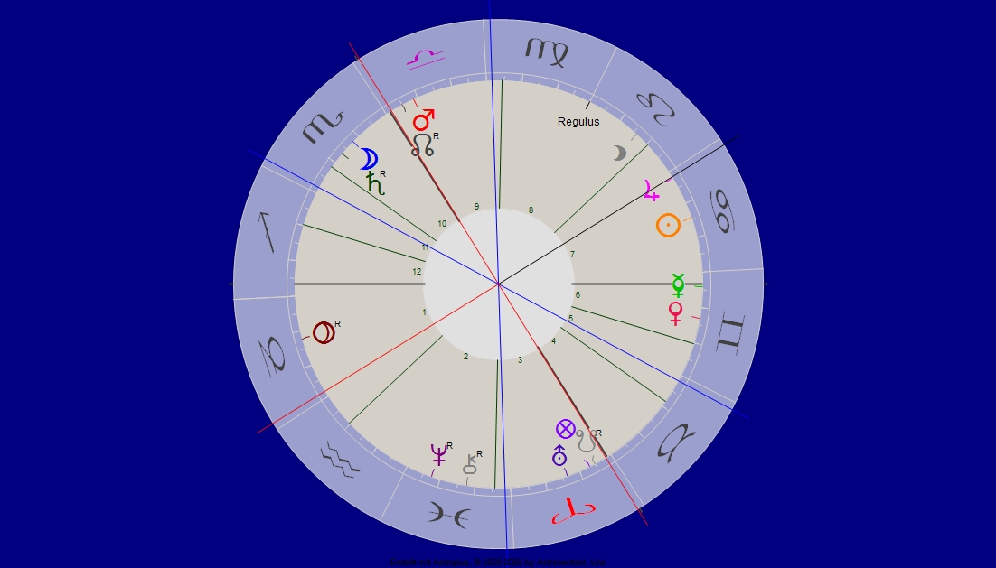 daß sich Wissen aus den Zwillingen mit dem Ausgleich in der Waage verbinde, und es ihm dabei gelinge, aus dem Widder – dem unfreiwilligen Krieger – die Vergangenheit zu schrumpfen – betreffs ihrer Bedeutung des Kriegerischen … dazu helfe uns das Sextil Merkur stationär/direkt zum Südknoten …