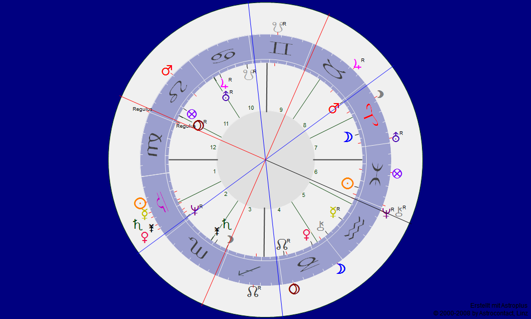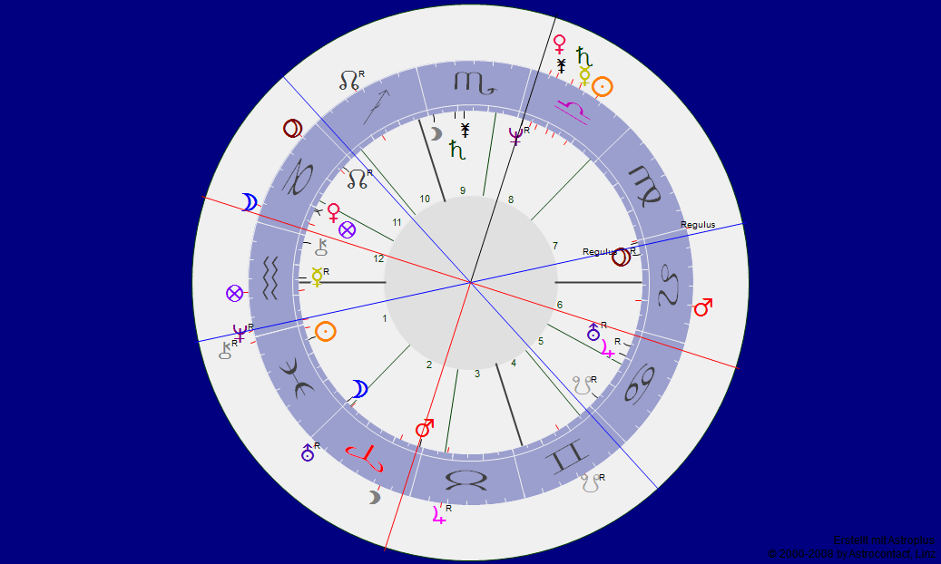 ein Querdenker mit Merkur rückläufig direkt am AC – da sieht man, wie sinnvoll querdenken ist – die Opposition von Mars zu Neptun, also Tatkraft und Vision, scheint ihn einerseits angetrieben, andererseits aber auch umgebracht zu haben. Der letzte direkte Aspekt von Neptun zu Neptun, Pluto über dem Nordknoten, Saturn in Haus 8 (unten Haus 2) … das sind so die Zeichen.
