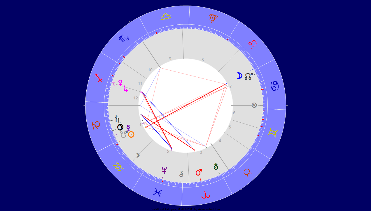 Es fällt besonders der große Bogen zwischen den mächtigen Langsamläufern auf: Uranus, Neptun und Pluto sind durch nahezu exakte Aspekte verbunden, Merkur steht auf dem Südknoten in Opposition zu Pluto.