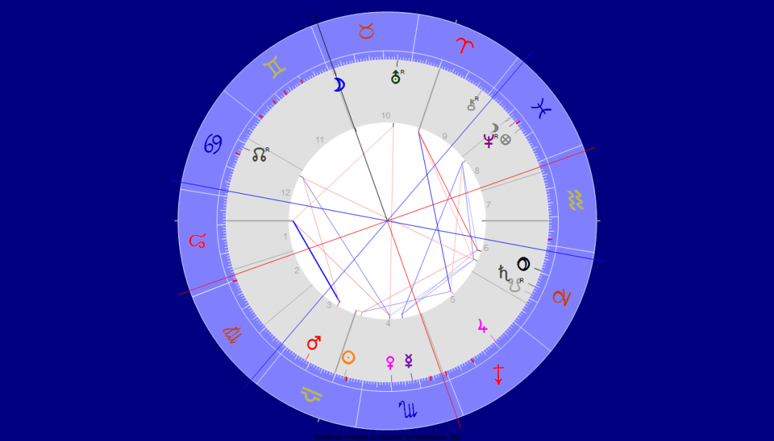 Mit dem Aspekt-Kreuz sieht man es sofort: Mond berührt keinen Planeten mit einem Aspekt bis er recht bald ins Zeichen Zwillinge wechseln wird. (04:30). Und die Sonne genauso ohne Aspekte. Den ersten Kontakt nach dem Leerlauf, den Mond haben wird ist das Sextil zu Chiron rückläufig im Widder (17.10 09:46). Und der Mond wird der Sonne erster Kontakt nach dem Sonnenleerlauf sein: Bereich der Gewahrwerdung. Kurze Entspannung nach Vollmond.