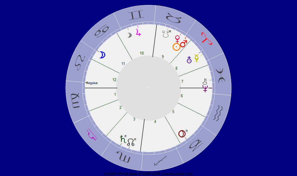 Im unteren Geburts/Sterbe-Horoskop des Kindes finden wir vor allem Chiron im ersten Haus am Nordknoten in Konjunktion mit Neptun – aber mehr noch – die exakte und berüchtigte Mars/Saturn Konjunktion aus dem 7. Haus.