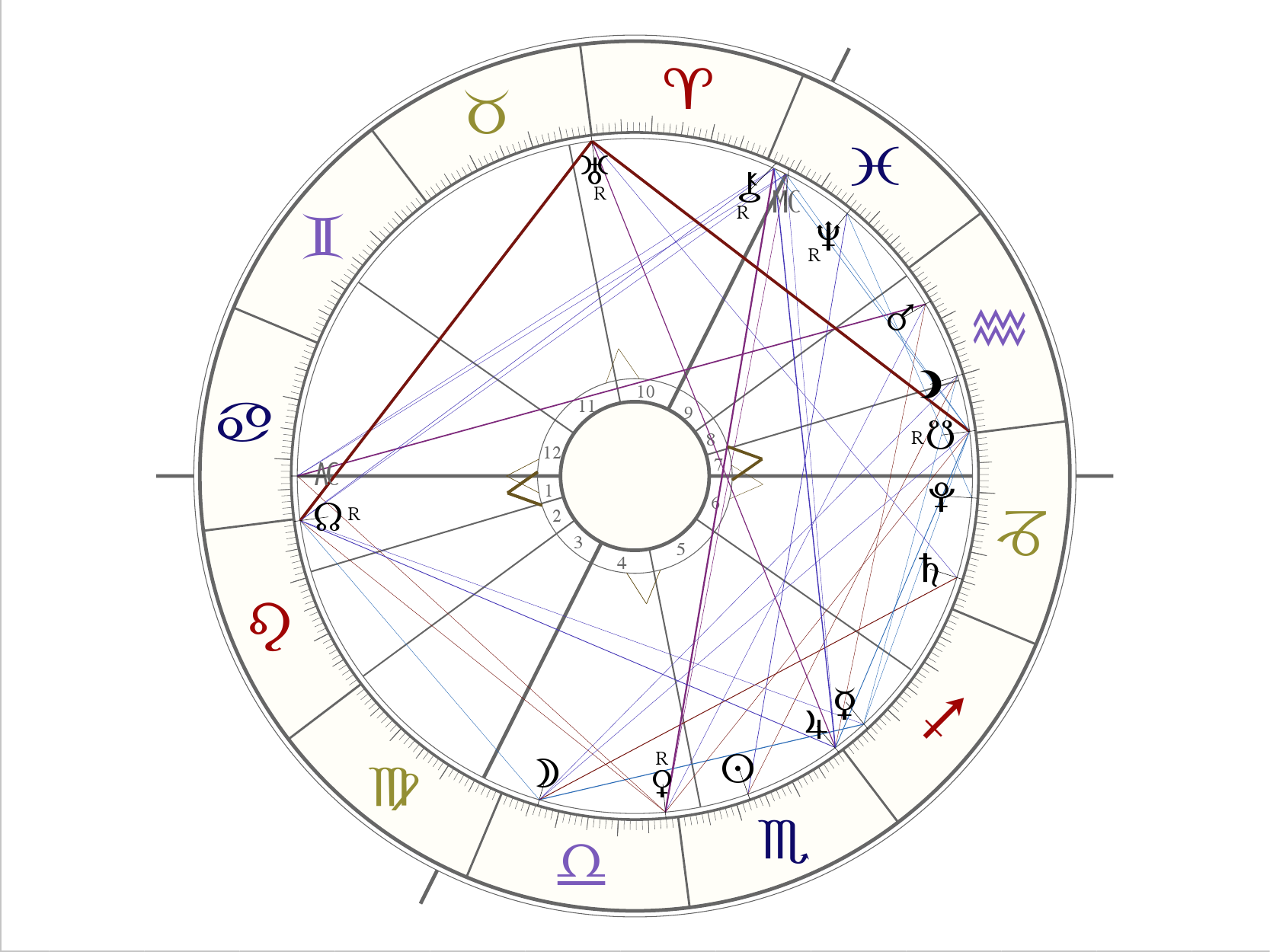 hier sehen Sie, was sich aktuell tut: Uranus im Stier rückläufig ist im T-Quadrat zu den Mondknoten, das sind die stark roten Linien zwischen den fixen Zeichen. Da muss sich also was bewegen im Stier, was sich wirklich nicht gern bewegt. Für den Stier-Bereich ist der stark von Wolfgang Döbereiner geprägte Begriff „Revier“ sehr von Nutzen. Man wird Stier-geprägte Menschen – also solche mit Aszendent oder Sonne, auch Mond und Venus in Stier, selbst Mars und Saturn auf je ihre Art – und Merkur gewiss ebenso – immer besser verstehen, wenn man weiß, dass sie Revierbauer sind. Welcher Art ihr Revier ist, ist eine ganz andere Frage. Es ist aber materiell. Selbst, wenn man als Stier-geborener Papst (Johannes Paul II) ist.