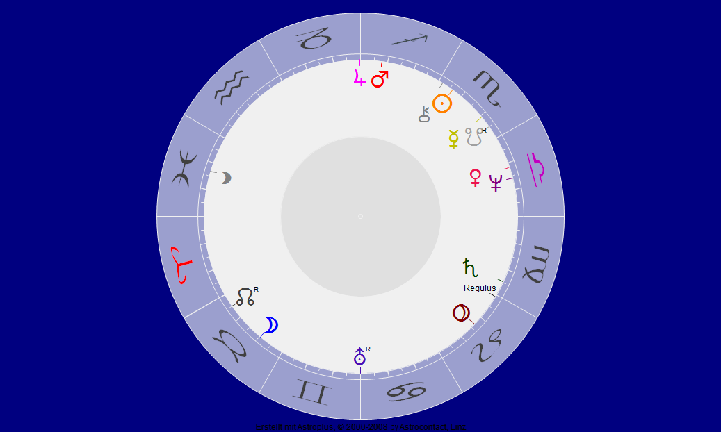 Hätten wir die jährliche Sonne/Saturn Opposition allein, die sich etwas rascher durchs Jahr verschiebt, wären nur die üblichen Stimmungsdämpfer um diese Zeit hinzunehmen. So jedoch gibt es mit Sonne/Pluto ein massives Macht-Selbstentfaltungs-Problem, eingebettet zwischen 2 Finsternissen. Jupiter ist noch immer rückläufig und ist daher trotz einer potentiell kräftigen Verbindung zu Mars im Löwen nur unter Aufbietung starker Konzentration auf die eigenen Kräfte nutzbar, und das auch nur im Verhältnis zu den eigenen Planeten, insbesondere Mars.