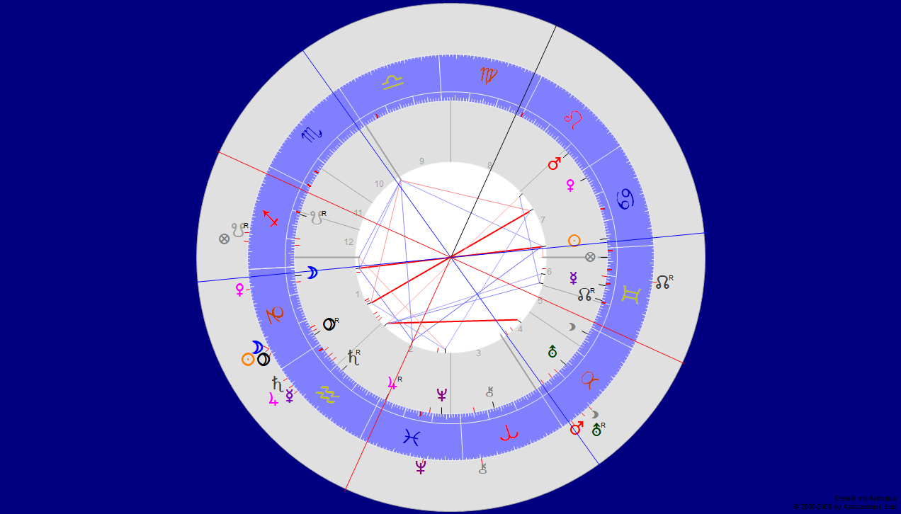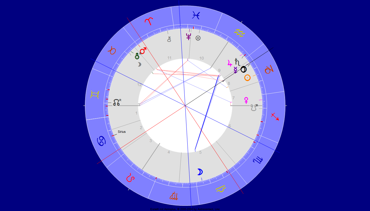 Das Horoskop oben ist der Augenblick, da mich dieser Gedanke trifft. Allein Pluto aus Haus 7 zeigt, wie mächtig die Widersacher sind. Doch Mond, der für den Fragenden steht im 6. Haus, dem Schützen, hat ein Sextil zu Jupiter, seinem Dispositor. „Noch ist Polen nicht verloren.“ Neptun regiert die ganze Szene. Chiron in Haus 10 sucht die Heilung des Amfortas vorzubereiten …
