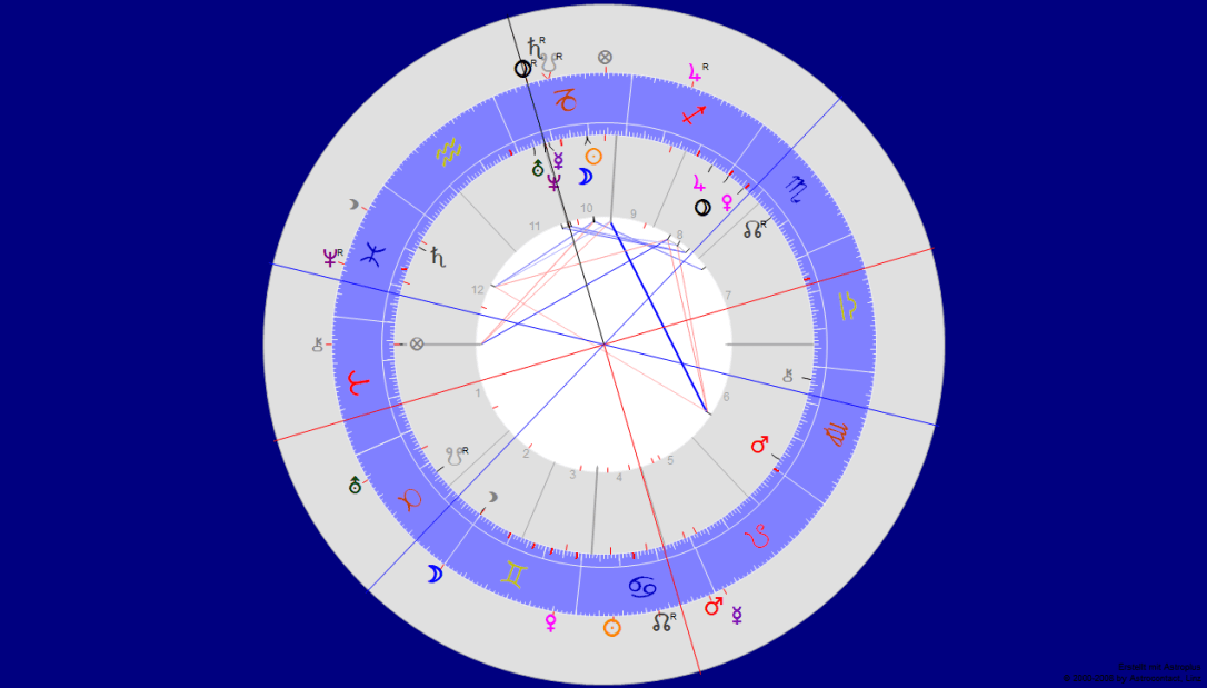 Und nun, mit Saturn rückläufig über den Mond, wendet er sich nochmals der Farbenlehre zu, wie in der Jugend seiner akademischen Laufbahn. Mond ist Herr des 9. Hauses.