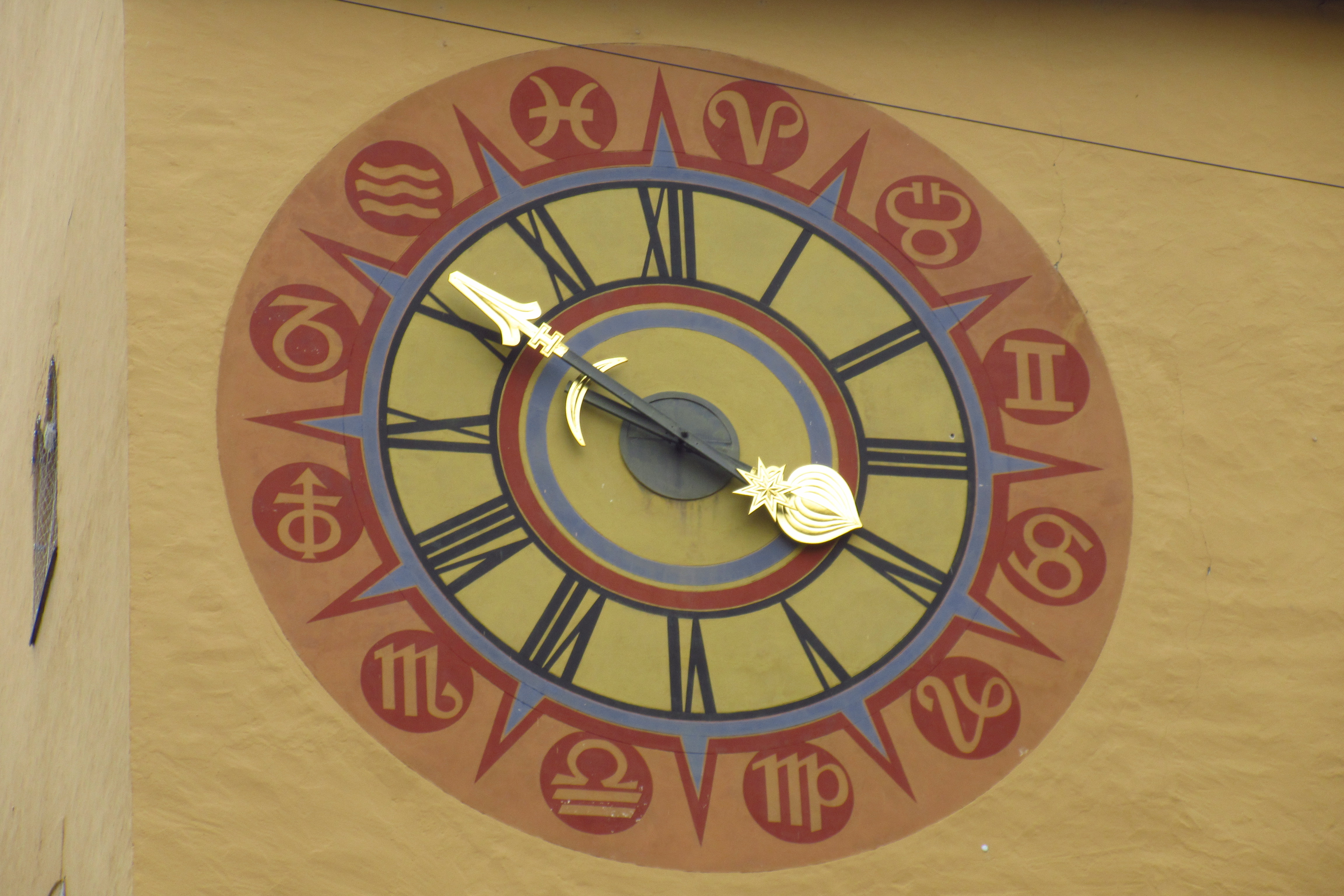 Daß Wassermann oben zwischen 10:00 und 11:00 Uhr regiert, hat nicht viel mit Astrologie zu tun, aber die Logik der Baumeister ist nachvollziehbar: man hat dem Zeichen Widder die erste Stunde gegeben: jene nach Mitternacht, was aber eigentlich Unsinn ist, aber zur Fische-Stadt Regensburg passt, zumal der Tierkreis obiger Uhr auch noch seitenverkehrt ist, gemäß der astrologischen Laufrichtung gegen den Uhrzeigersinn … merkwürdiges Mischprodukt.