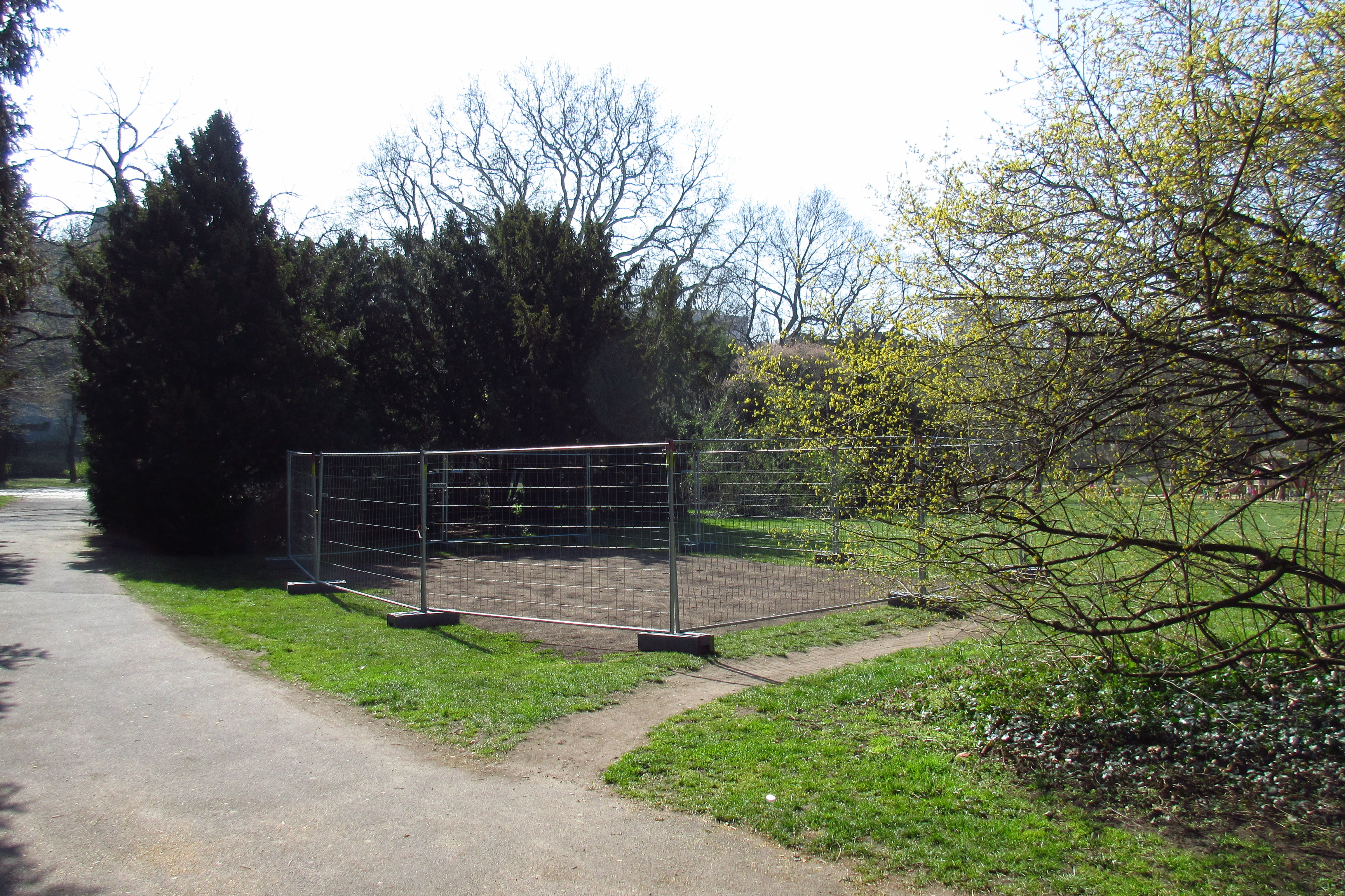 Wo vorher die Rosen noch letztes Jahr eine Pracht boten, und dem Namen des Ortes Ehre, ist jetzt offene Erde mit frisch angesähtem Rasen.