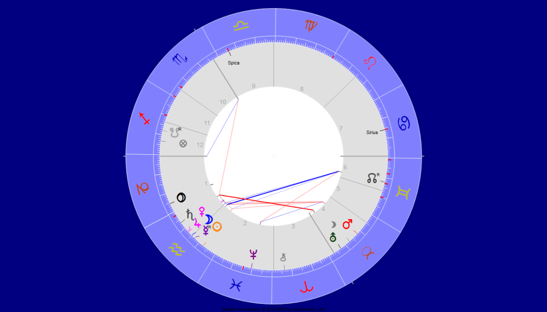Hier bilden Sirius, Merkur – Gott der Diebe – und Uranus in den Fischen in Konjunktion mit dem Glückspunkt ein riesiges Wassertrigon. Astrologisch zählt Sirius zu den Jupiter-Mars Fixsternen. Im Trigon zu Merkur verkündet er „großen Ruhm, aber mit Gefahren verbunden.“ (Michael Uhle, Fixsterne, Chiron-Verlag) Man beachte bitte auch die Pyramide im Bild, die Diamantenform (Kohlenstoff) und das Quincunx von Jupiter und Merkur mit dem Zwillings-Mond als Apix! Außerdem den Mond im Trigon zu Neptun, und natürlich die Bedeutung der Uranus-Saturn Achse im Bild.