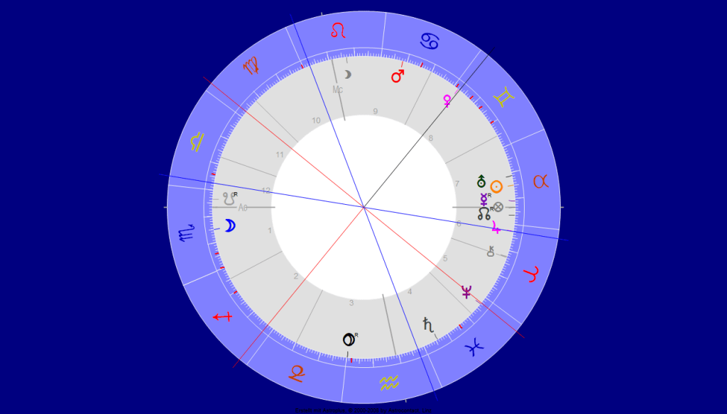 Pluto, die Macht in Opposition zu Mars, ebenfalls im Haus 9, ist rückläufig und noch im Wassermann, schlecht informiert im dritten Haus: die Hybris dieser „Jünger Coronas“ findet nicht mehr heim. Und Jupiter, der Weise, regiert jetzt aus dem Stier-Stellium im Haus der offenen Feinde und Partner, dem 7ten Haus. Die Sonne, die hier für die Autorität steht, weil sie den Löwen des 10ten Hauses beherrscht, ist verborgen in Haus 8 im Zeichen Zwillinge: Sonne ist die Oberstaatsanwältin, die verloren hat. (Dass Berufung eingelegt würde, war ohnehin klar – hat jetzt aber mehr, als ein Gschmäckle … )