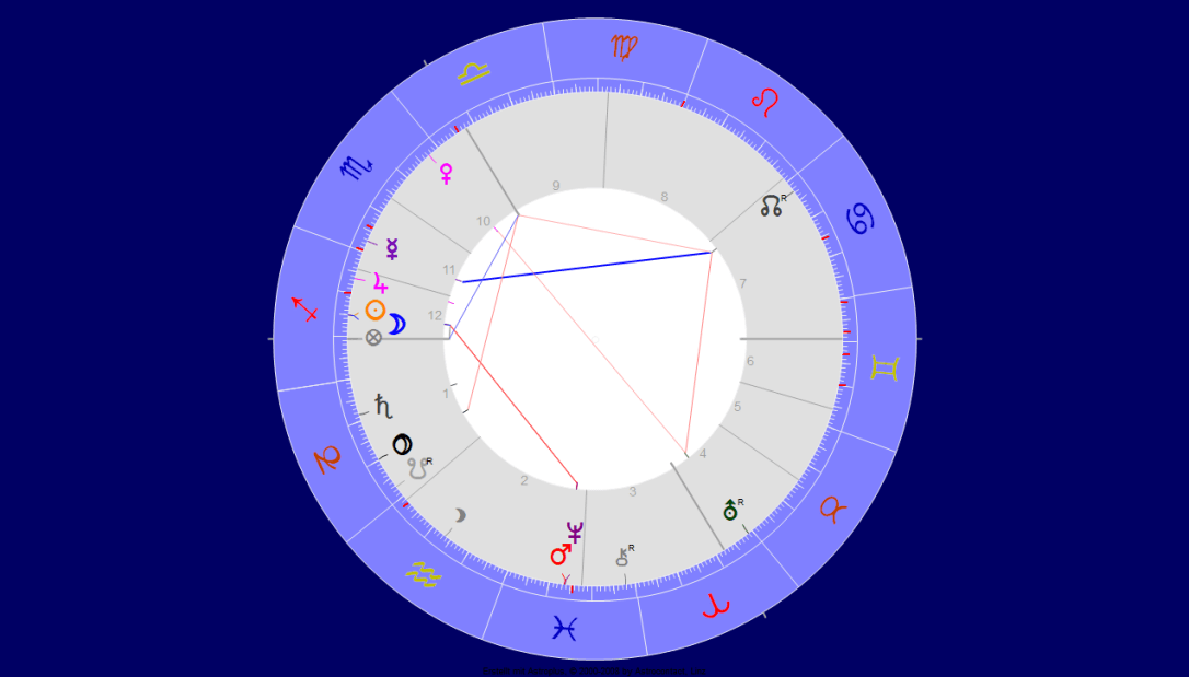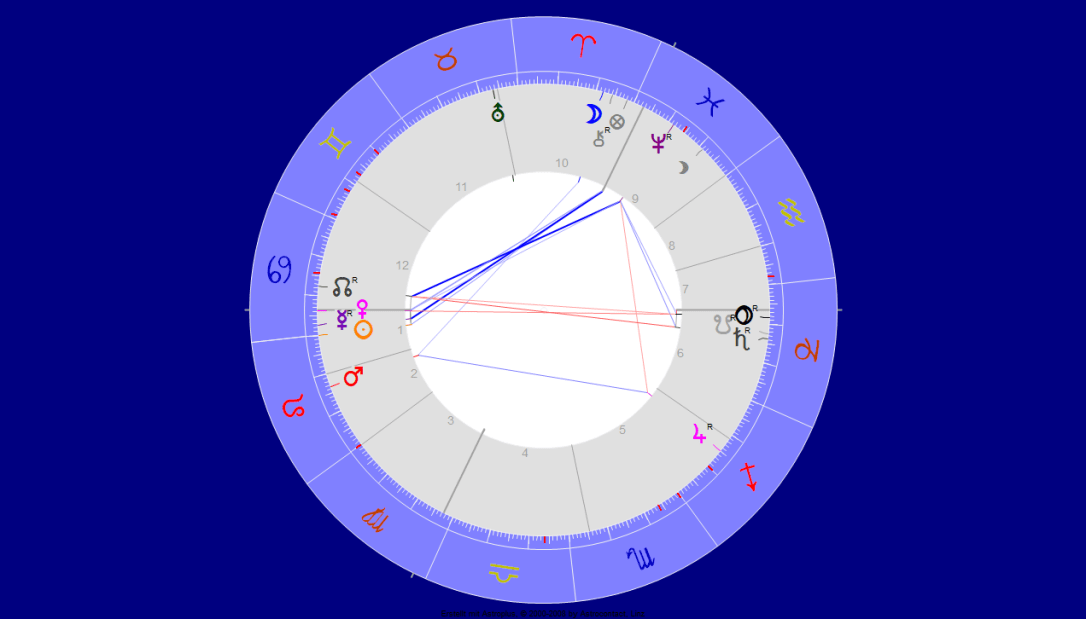 Moon/Uranus plus Neptun in Aquarius in houses 11 and 12 is like a genius public radio system. Jupiter Cancer holds strongest position, means roots (in water). There is a parental conflict – the chart saying: be yourself or have success – both is the recompense of a long hard life-struggle.