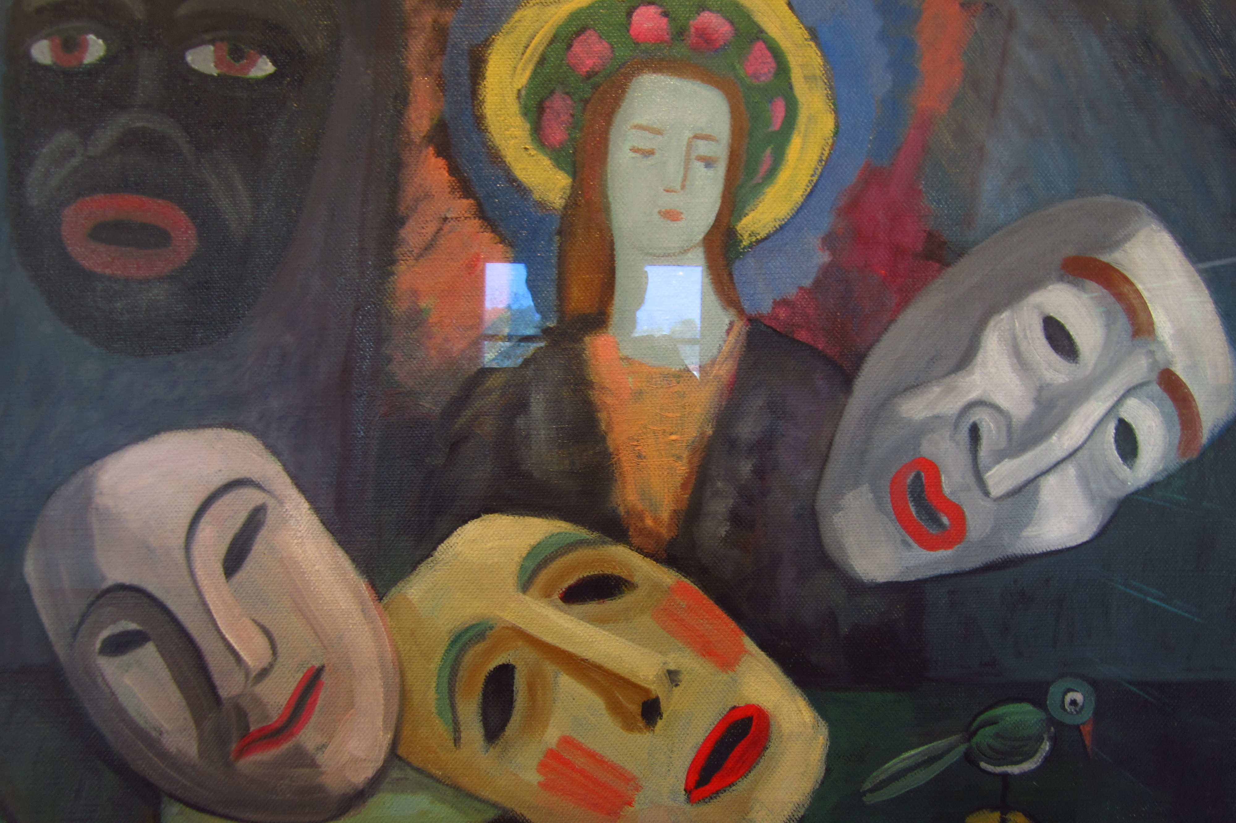 Oberes Gabriele Münter-Bild erinnert eher an Neo Rauchs Bewußtseinstreppen. Der Kranz der Madonna – die aber bitter schaut – auch auch die Astrologie dieser Fische-Persönlichkeit wunderbar bekränzt … in Gabriele Münters Bild repräsentiert das Ich der kleine Vogel, wie mir scheint – in der davon unverschämterweise als neues Kompositions-Kunstwerk genommenen Fotografie kommt ein anderes Punktum (nach Roland Barthes, der zuerst bemerkte, daß es in wertvollen Bildern immer etwas gibt, was in Bezug auf die Komposition des Bildes aus dem Rahmen fällt – und das nannte er „Punktum“ – siehe, Roland Barthes 5.11.1915 Cheerburg) in seinem wunderbaren Buch: „Die Helle Kammer“) fast unbemerkt in die Mitte: das gespiegelte Fenster-Vorderglasmalerei. Aber auch das ist ein Symbol für das Ich.