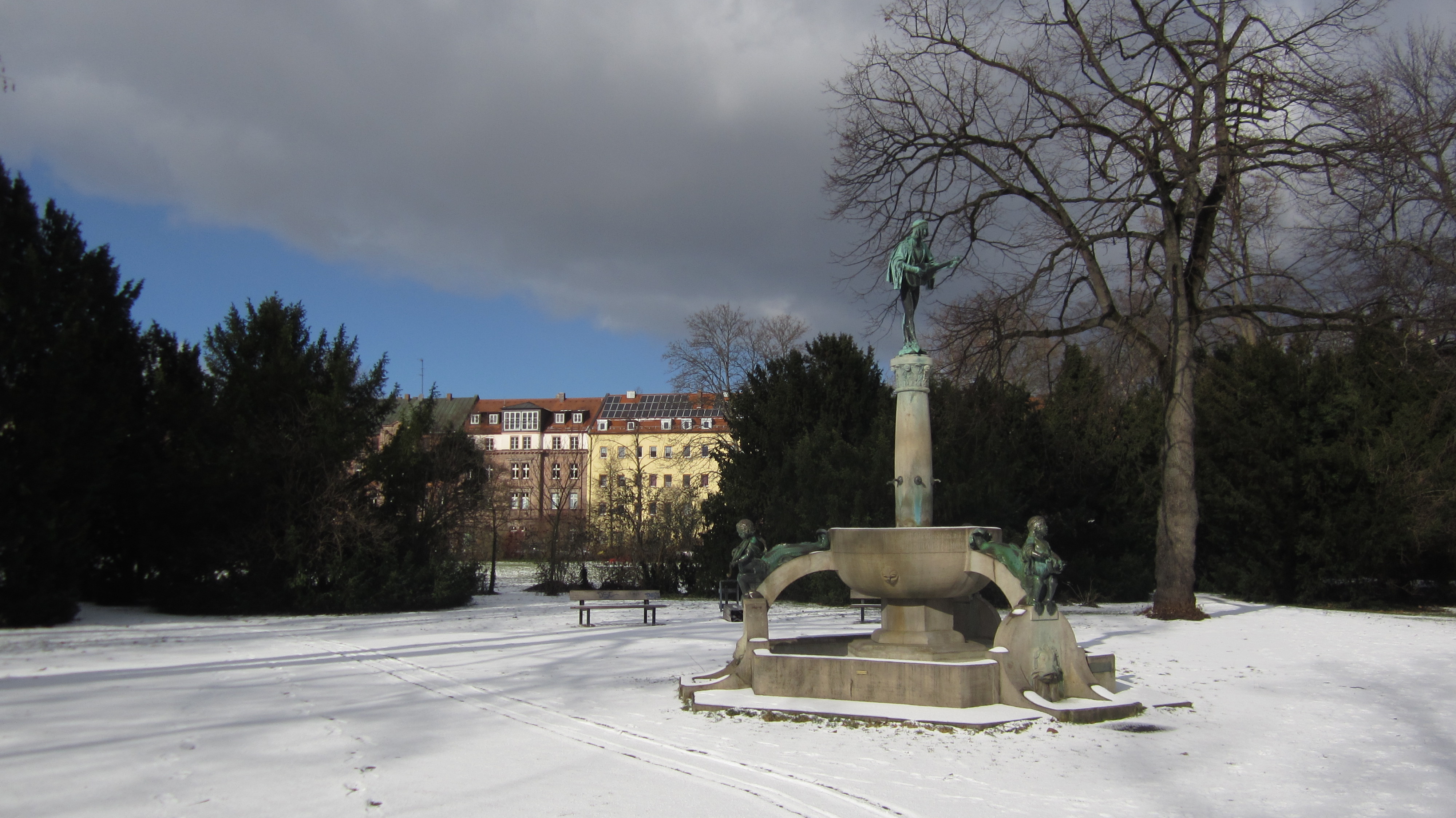 der gefrorene Bronze-Sänger in der Rosenau hält sich mit dem Klang der Stille warm! Der Chor, den er leitet, sind aktuell die Spatzen, die sich in riesigen Gruppen mitten im Blicke verbergenden Gezweig aufgeregt viel zu sagen haben.