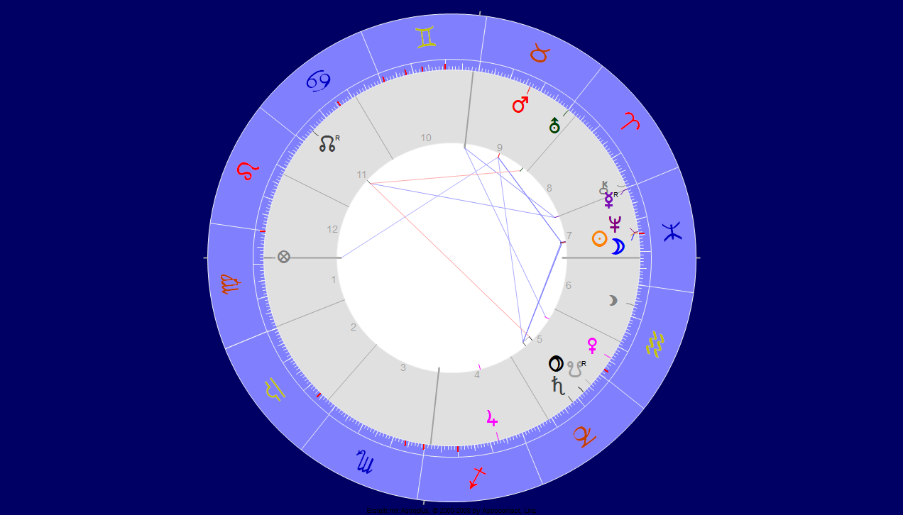 Und Merkur/Mond im Löwen passt ebenfalls hervorragend zum Presse-Großkotz-Gehabe: „You won´t get it anywhere else!“ – Neptun/Uranus sind verbunden im Zeichen Schütze, der Traum von der Revolution, den edlen Zielen in Opposition zu den eigenen plutonisch/gesellschaftlichen Machtansprüchen: in diesem Spannungsverhältnis wird die Tageszeitung erstellt. Uranus ist Herr von Haus 7 – zur richtigen Gesellschaft stehen die Zeitungen in Opposition, Freiheit ist Gegner. Einsam hält dort Chariklo des matriarchalen Posten, die jüngste und damit diejenige, die zum Presse-Gegengewicht werden könnte: Anmut vs. Presse.