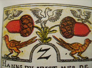 Für die ‚zivilisierten‘ Römer waren Menschen, die keine Tempel und Götterbilder kannten wie die Kelten und Germanen, Barbaren. Ihre ‚Tempel‘ waren die heiligen Haine. Ihre Götter wohnten in Bäumen, vor allem in Eichen (Christian Rätsch, Lexikon der Liebesmittel). Hier sehen wir auf einer mittelalterlichen Darstellung, wie sich der Seelenvogel, der dem Urvogel Archaeopteryx auffallend ähnelt, auf dem Zweig zwischen den Eicheln sich erhebt.